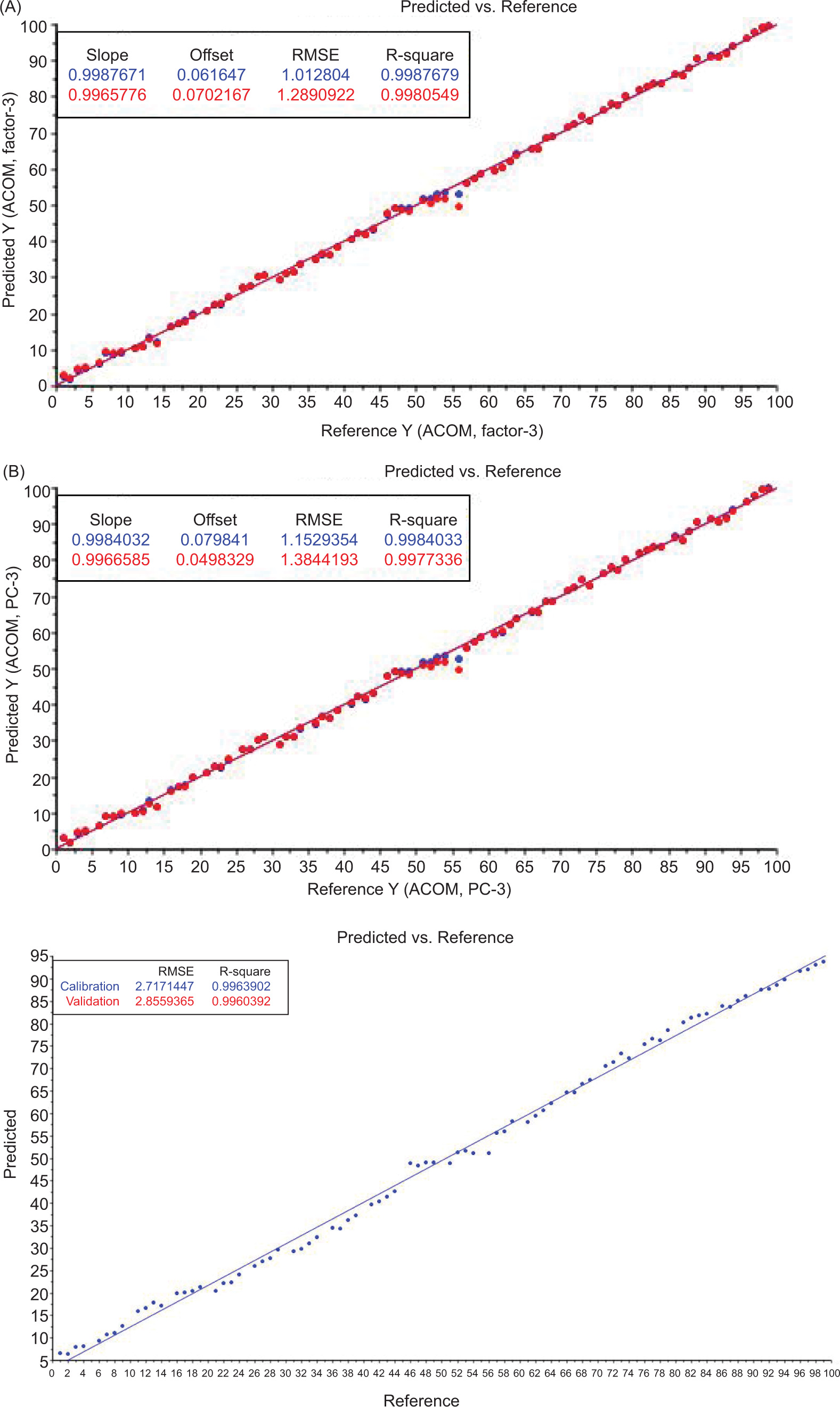 Figure 5. PLSR (A) and PCR (B) in 3000-950 cm-1 and SVR (C) in 2500-950 cm-1 of the calibration set for camel’s milk adulterated with cow’s milk.