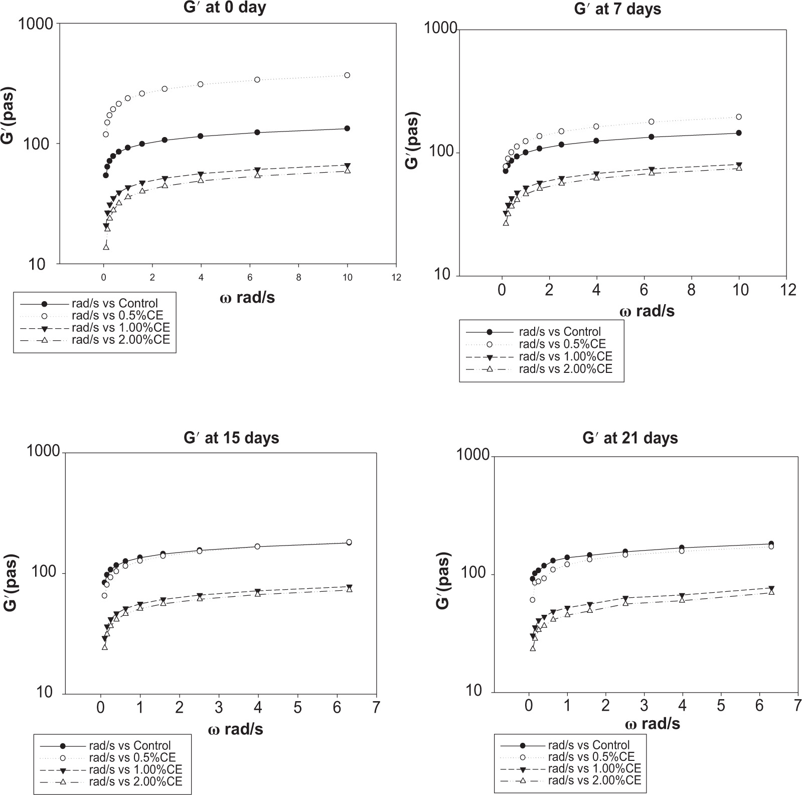 | 0.5% CE | 8.91±0.11a,A | 8.11±0.30b,B | 5.01±0.38b,C | 5.07±0.79a,C |