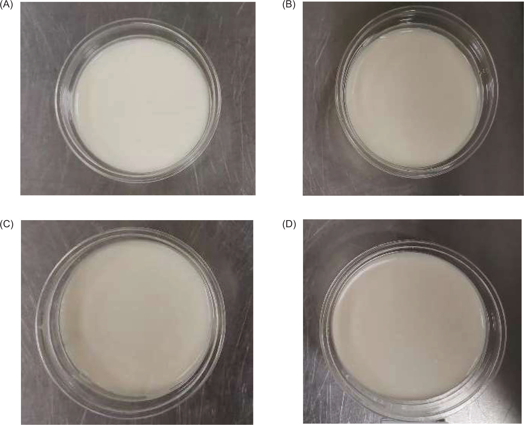 Figure 2. Photograph of yogurt. (A) Control (0%CE); (B) 0.5% CE*; (C) 1%CE; (D) 2%CE. * CE: clove extract.