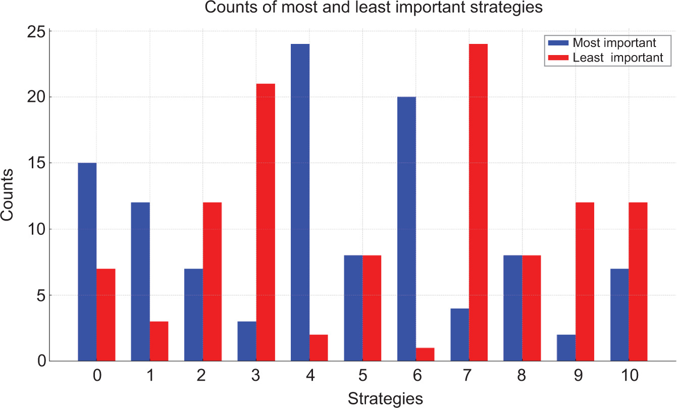 These results provide a clear ranking of the strategies from most to least valued, based on the collected responses. The individual rankings of the “Most Important” and “Least Important” strategies closely align with the “Net Score” ranking, confirming the reliability of the results. A visual representation of the data helps to better understand the distribution of the “Most Important” and “Least Important” strategies, as well as the net scores for each. The blue bars represent the counts of strategies selected as “Most Important,” while the red bars represent those selected as “Least Important.”
