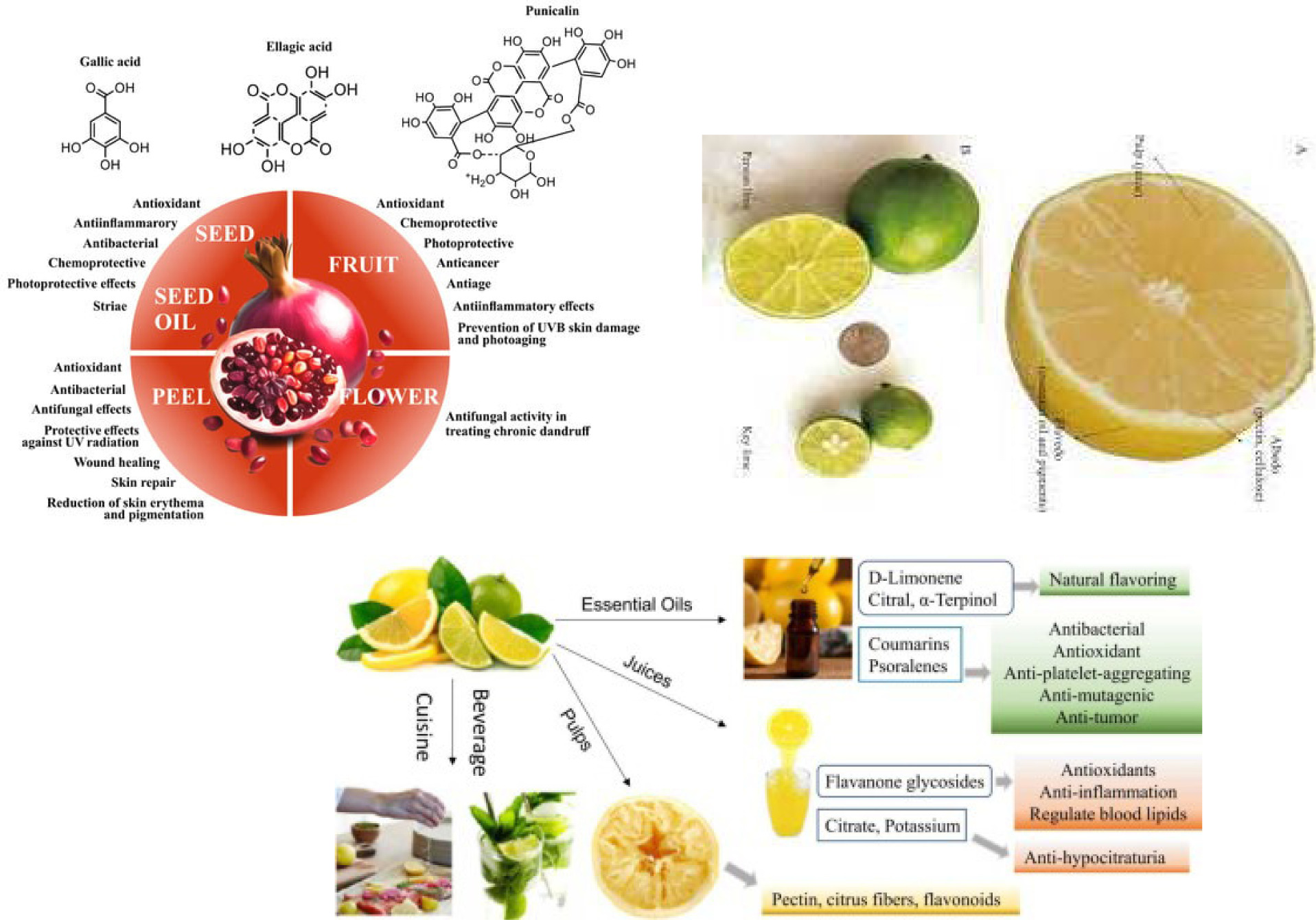 During the last few decades, consumer focus on health and wellness has increased the demand for functional foods. Scientific evidence suggests that a diet rich in fruits and vegetables has preventive benefits, and antioxidants are recognized as compounds that protect cells from damage caused by oxidative stress. Consequently, consumer demand for natural antioxidants has increased, and the use of natural antioxidants to replace synthetic ones is rising. Animal products are particularly susceptible to oxidation, beginning when animals are transported and usually increasing exponentially a few days post-mortem. Natural antioxidants can be added to fresh meat, meat products, and animal diets to enhance color stability and inhibit lipid oxidation. Fruits, vegetables, plant extracts, juices, essential oils, herbs, spices, and marine algae can serve as natural antioxidant compounds (Ford et al., 2024; Li et al., 2024). The pomegranate is a tropical fruit used in food and traditional medicine due to its medicinal properties. Pomegranate juice is rich in antioxidant compounds such as tannins, flavonoids, and anthocyanins, and has been shown to have positive effects against chronic diseases. Lemons are known for their high levels of ascorbic acid (vitamin C) and flavonoids like hesperetin and naringenin, which act as antioxidants. A recent study compared two methods of lemon preparation and their potential benefits for reducing meat product oxidation. The bioactivity of pomegranate and lemon phenolics suggests their potential use as natural sources of phenolic compounds in functional meat product formulations (Figure 1). These functional ingredients could provide health benefits beyond basic nutrition. However, there is limited understanding of how to incorporate such extracts into meat formulations while maintaining consumer acceptability, which is an important aspect of developing this market opportunity (Begić et al., 2024; Chauhan et al., 2024).