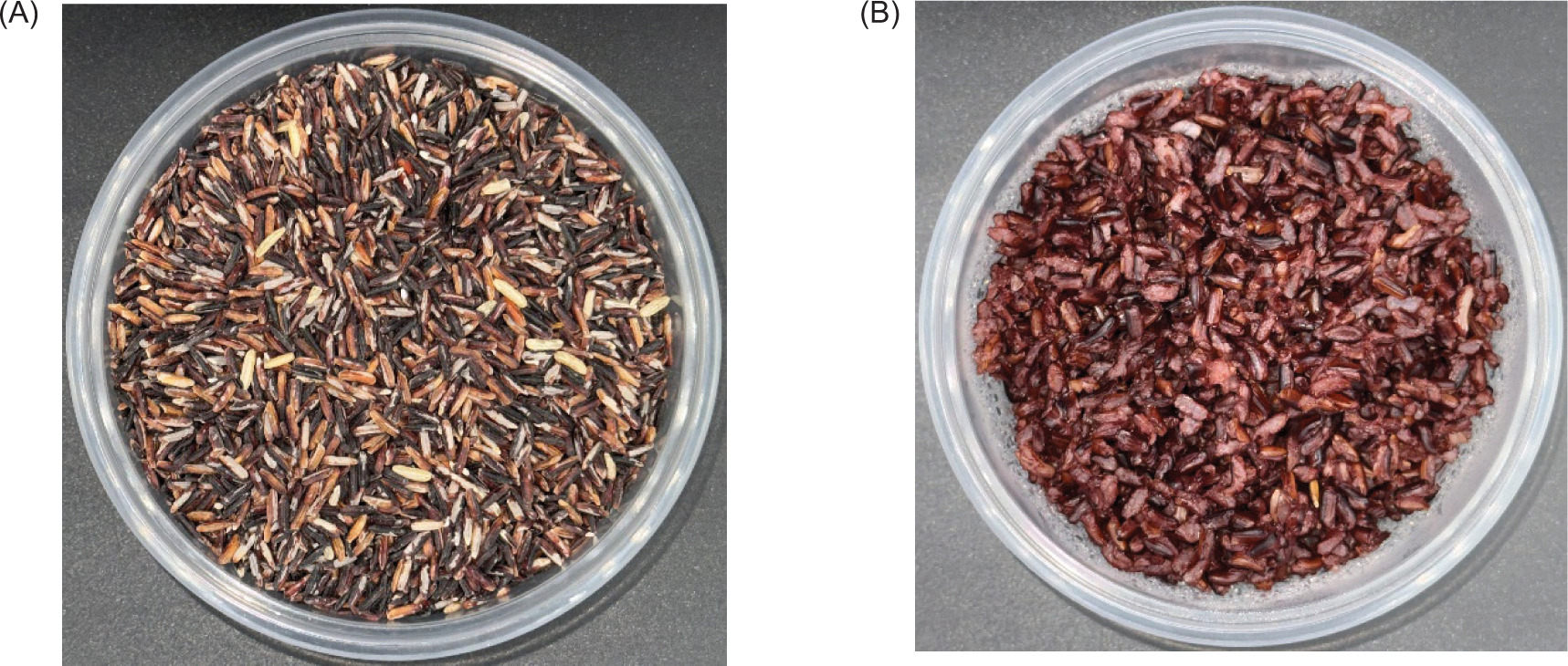 Figure 1. Riceberry (A) and Pre-gelatinized riceberry (B).