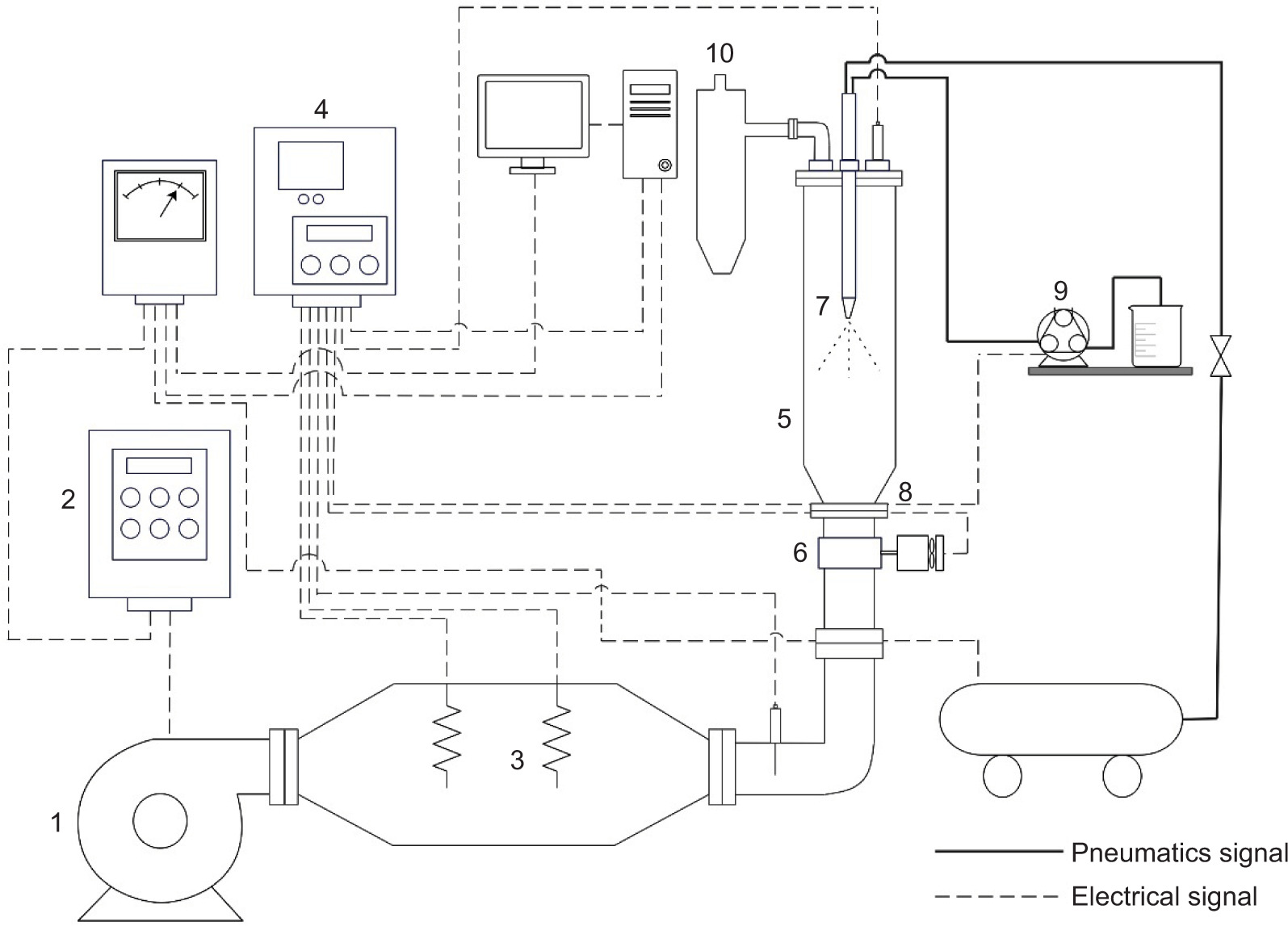 Figure 2 illustrates the lab-scale fluidized-bed agglomerator equipped with a pulsed-air setup. Ambient air was drawn into the agglomeration system through an air blower powered by a 1-hp motor (Mitsubishi Electric Automation, Thailand Co., Ltd.) (number 1), with its velocity modulated using an inverter (Model H-3200 Series, Haitec Transmission Equipment Co., Ltd., China) (number 2). The air used for fluidization was heated in a heating box consisting of ten 1-kW finned heaters (number 3), with the temperature regulated by a PID temperature controller (Model MAC-3D, Shimax Co., Ltd., Japan) (number 4).