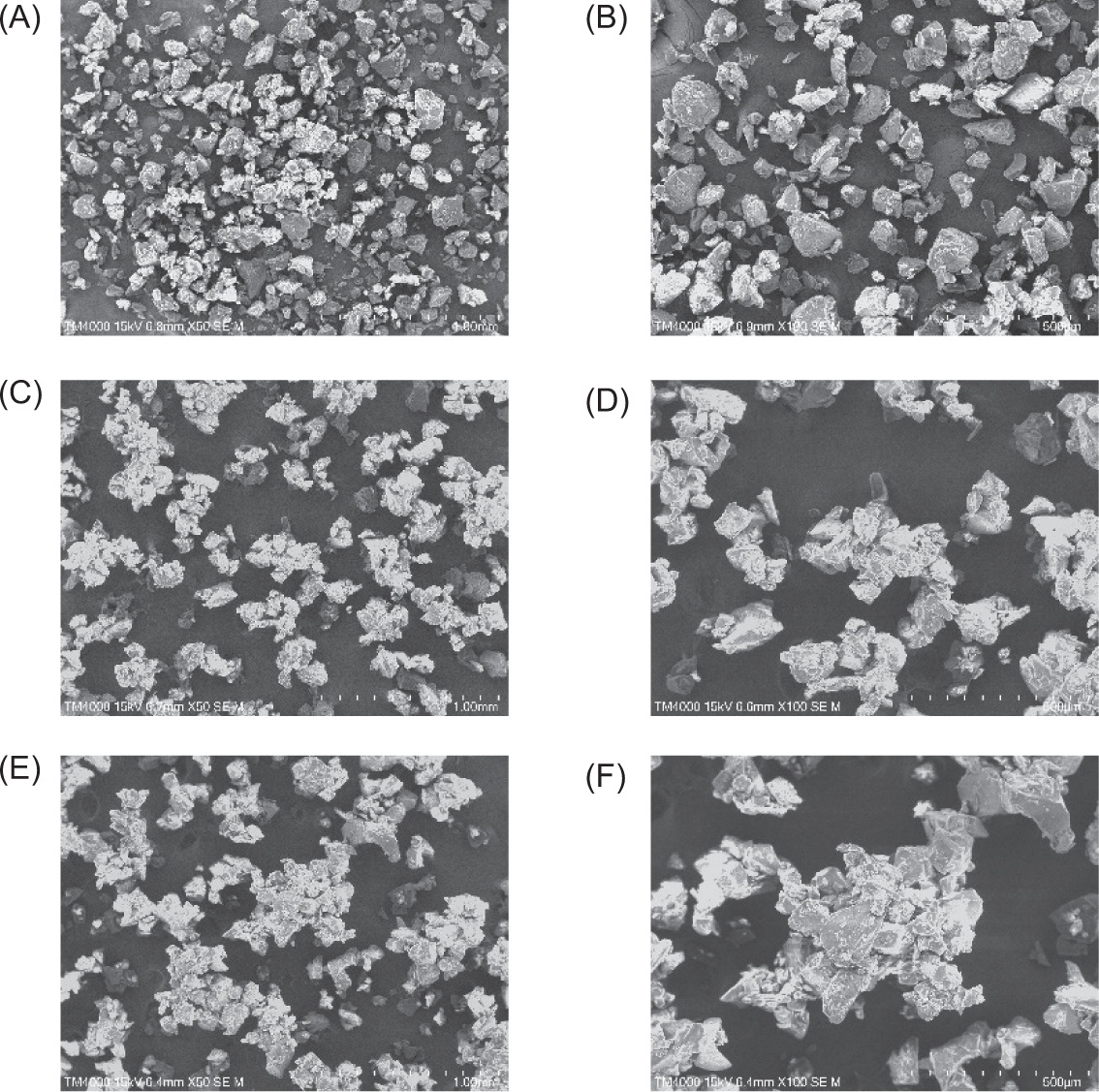 A scanning electron microscope (SEM) (Tabletop Microscope, TM4000Plus, Hitachi, Hitachi High-Tech Ltd.) was utilized to examine the morphology of the particles. The SEM was operated at magnifications of 50× and 100× with an accelerating voltage of 15 kV.