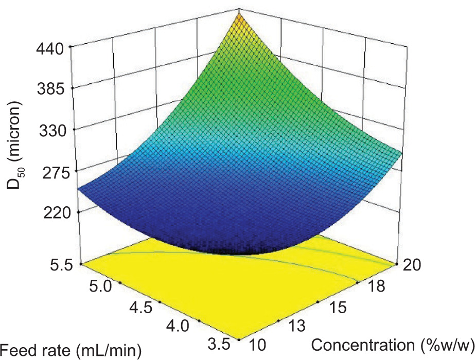 Response surface methodology (RSM), associated with a 32 full factorial design using Design-Expert (Stat-Ease, Inc.), was used to investigate the impacts of two agglomeration parameters: binder feed rate (3.5–5.5 mL•min–1) and binder concentration (10–20% w/w) on the responses of moisture content (MC), mean particle size (D50), and process yield (%yield). Furthermore, quadratic correlations of all factors and their responses were used to explore the influence of operating variables on quality attributes.
