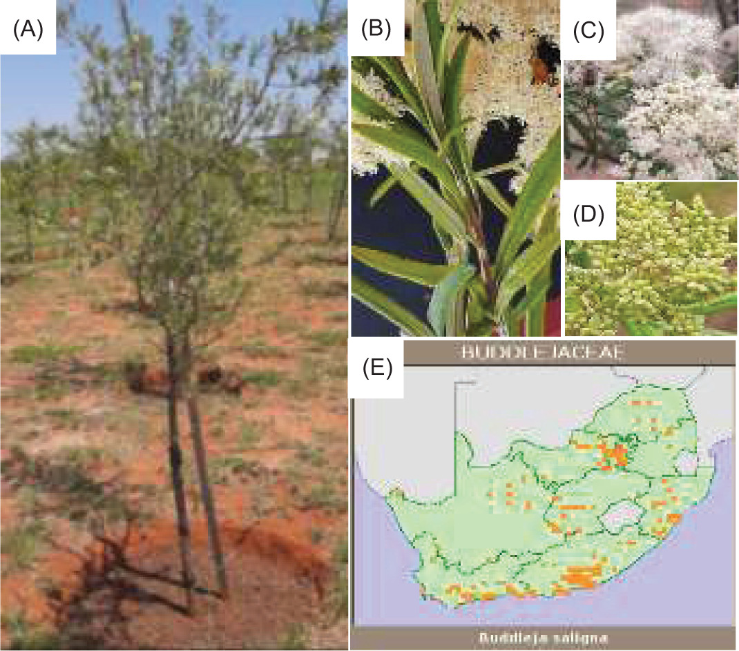 Figure 1. The morphological characteristics of B. saligna and its distribution map: (A) whole tree, (B) leaves, (C) flowers, (D) fruits, (E) distribution map.