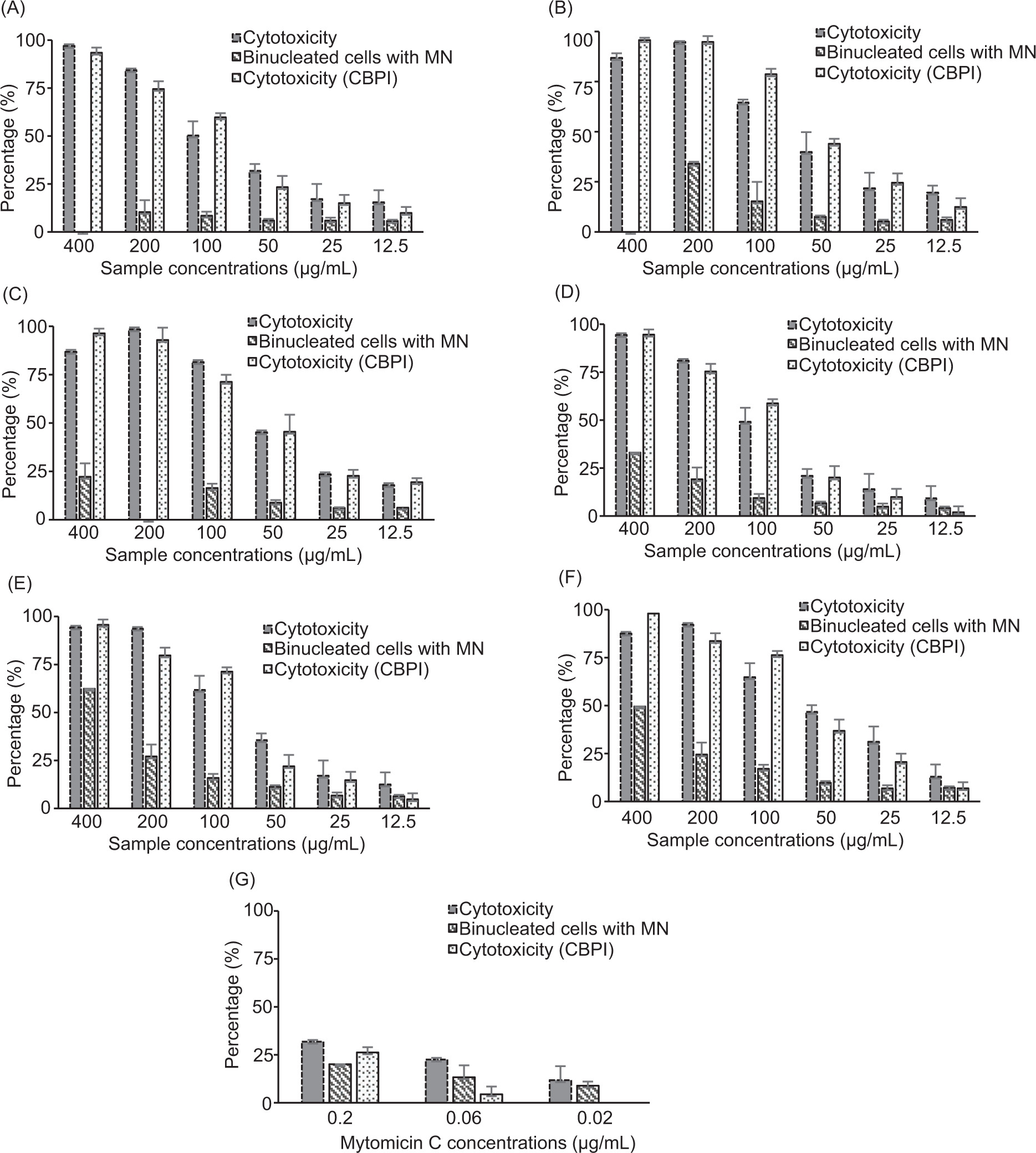 Figure 3. Percentage of cytotoxicity and cytotoxicity CBPI and of binucleated cells with MN in CHO-K1 cells after a 24-hour incubation with different concentrations of the tested samples (µg/mL) and subsequent 24-hour incubation with 3 μg/mL cytochalasin B. (A) B. saligna (BS) material harvested at the vegetative stage and extracted by maceration; (B) BS material harvested at the fruiting stage and extracted by maceration; (C) BS material harvested at the flowering stage and extracted by maceration; (D) BS material harvested at the vegetative stage and extracted by UAE; (E) BS material harvested at the fruiting stage and extracted by UAE; (F) BS material harvested at the flowering stage and extracted by UAE; (G) MMC (positive control).
