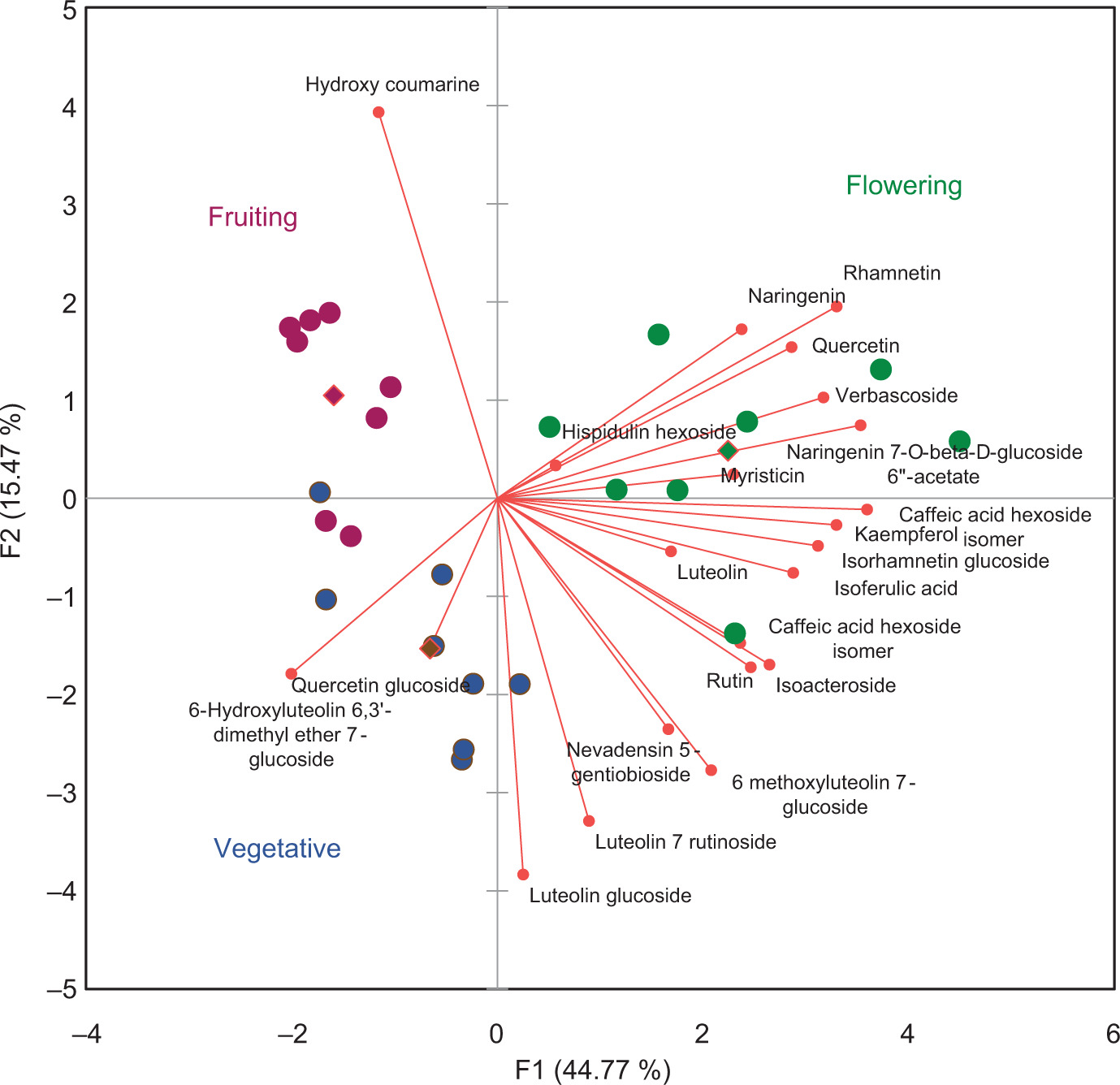 Figure 4. Score plot of bioactive compounds detected in the three phenological stages (vegetative, flowering, and fruiting) of B. saligna (Willd.) extracts.
