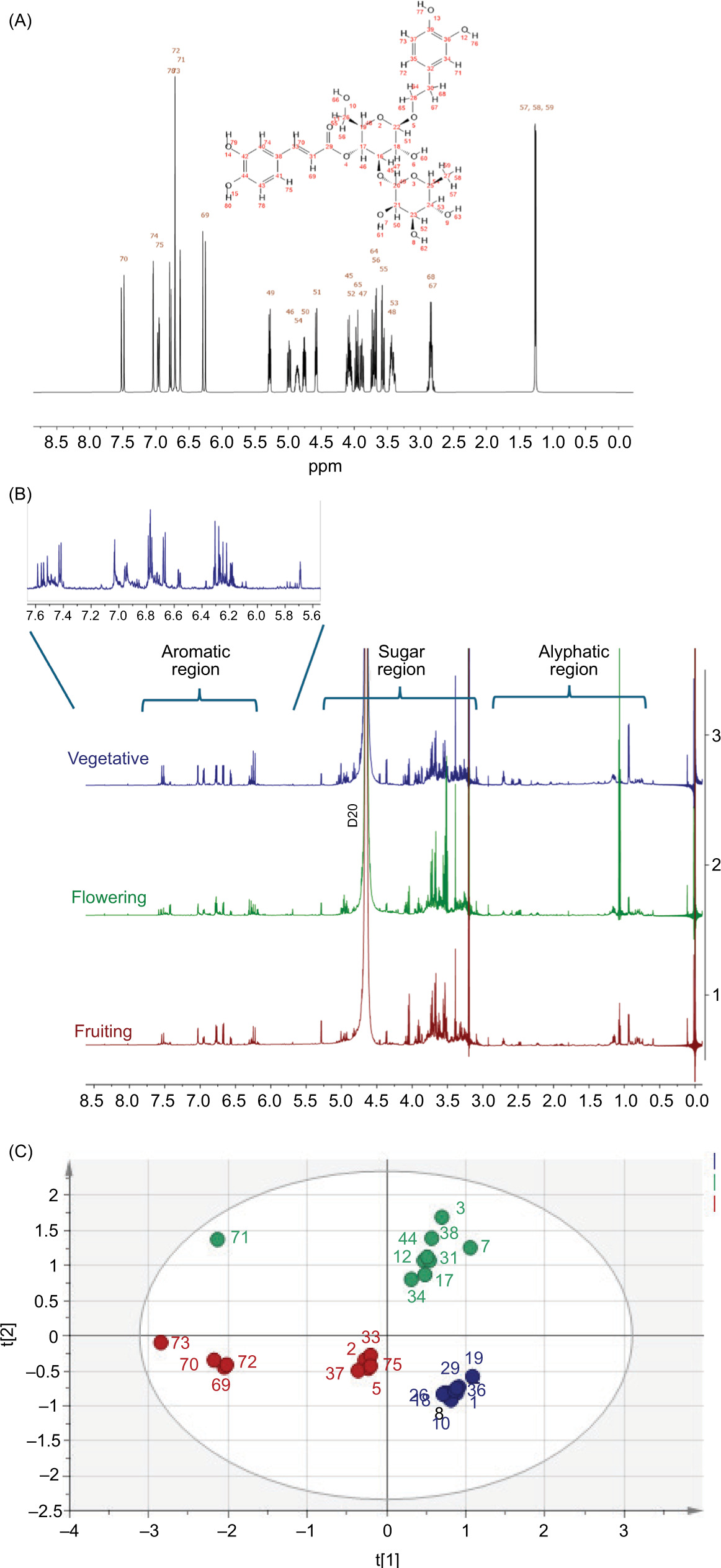 Figure 5. 1H-NMR spectra (solvent used CH3OH-d4 and D2O [KH2PO4 buffer, pH 6.0] at 600 MHz) and PCA scores plot of phenological stages of B. saligna (Willd.). (A) Verbascoside simulated spectrum; (B) Stacked spectra of flowering, fruiting, and vegetative extracts; and PCA scores plot-vegetative (blue), flowering (green), fruiting (red); (C) PCA scores plot-vegetative (blue), flowering (green), fruiting (red).