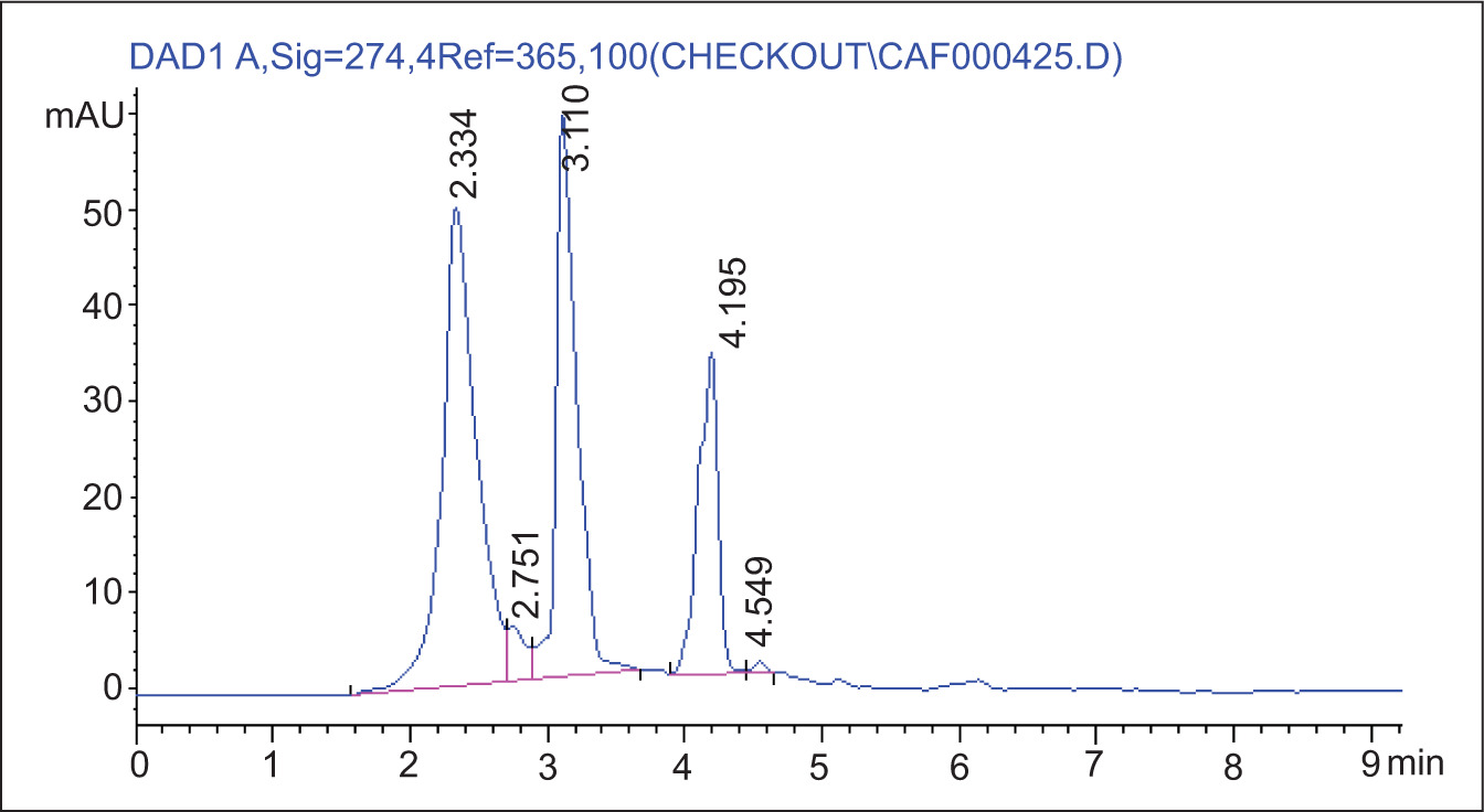 Wheat is widely used as a key ingredient in various food items such as cakes, biscuits, and breads. Various wheat-based food items can become contaminated with mycotoxins, compromising the quality of these products (Hedayati et al., 2016). Various mycotoxins in wheat were measured to assess the highest level of contamination. Mycotoxins (AFs, OTAs, DON, and FUMs) were measured through HPLC. The chromatograms for various mycotoxins are presented in Figures 1–4.