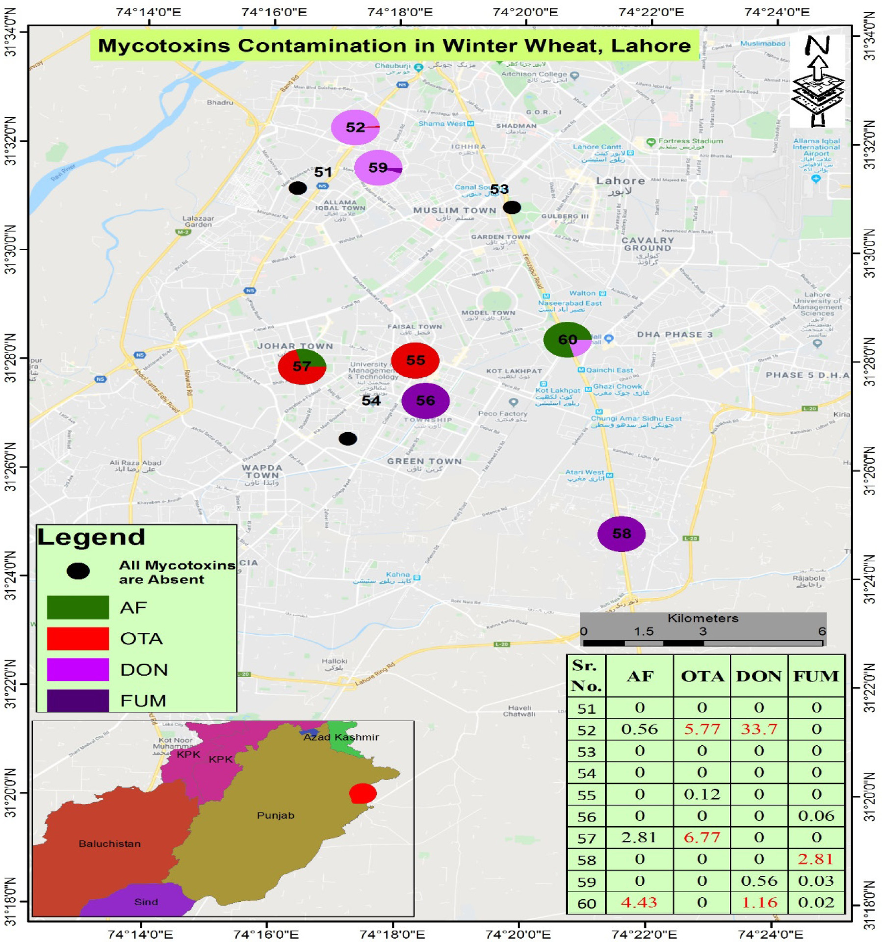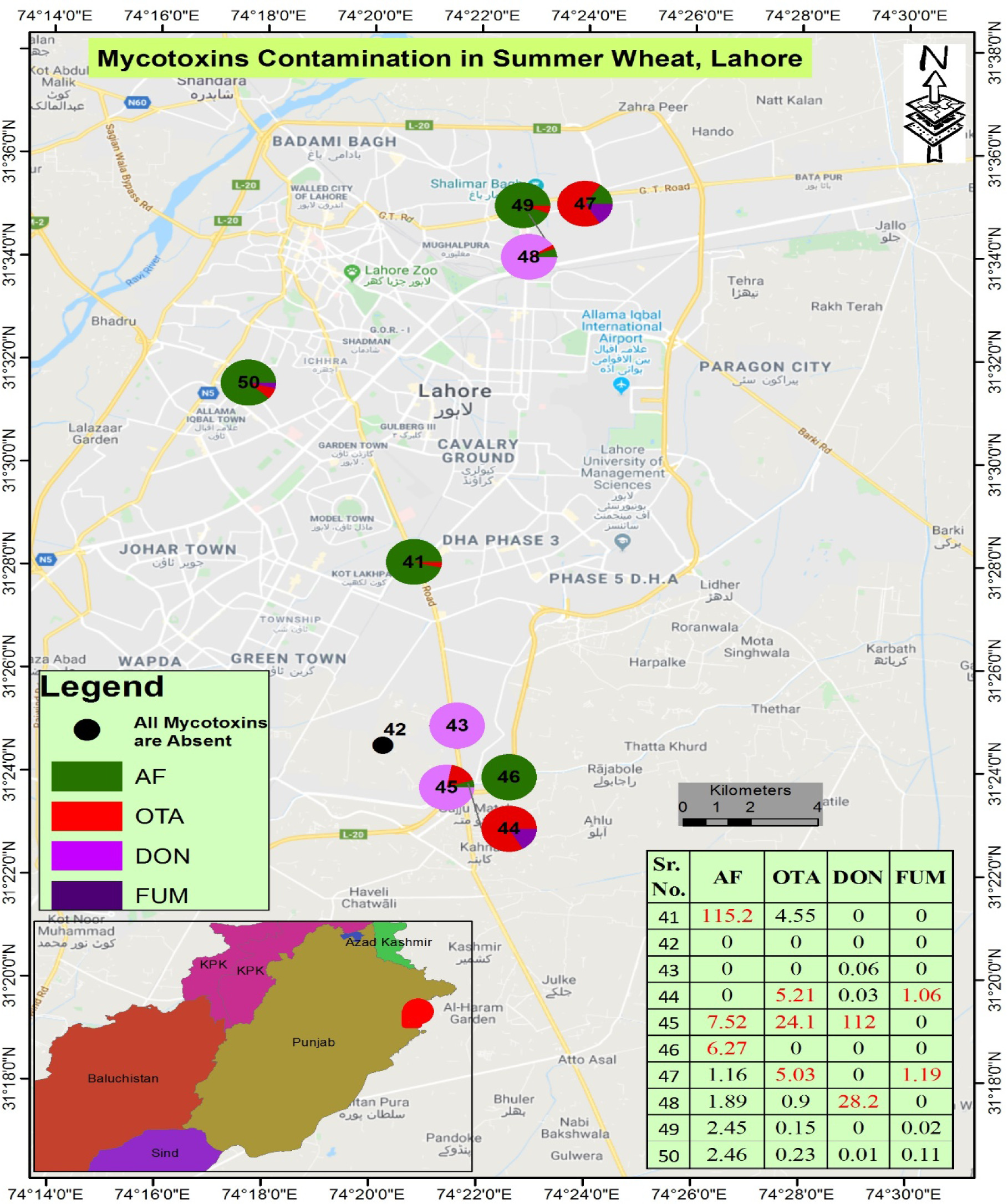 Contamination levels of total AFs, OTA, DON, and FUMs in wheat samples collected from Lahore were recorded at 0.56–115.19 μg/Kg, 0.12–24.13 μg/kg, 0.01–112.00 mg/kg, and 0.02–2.81mg/kg, respectively (Table 1).