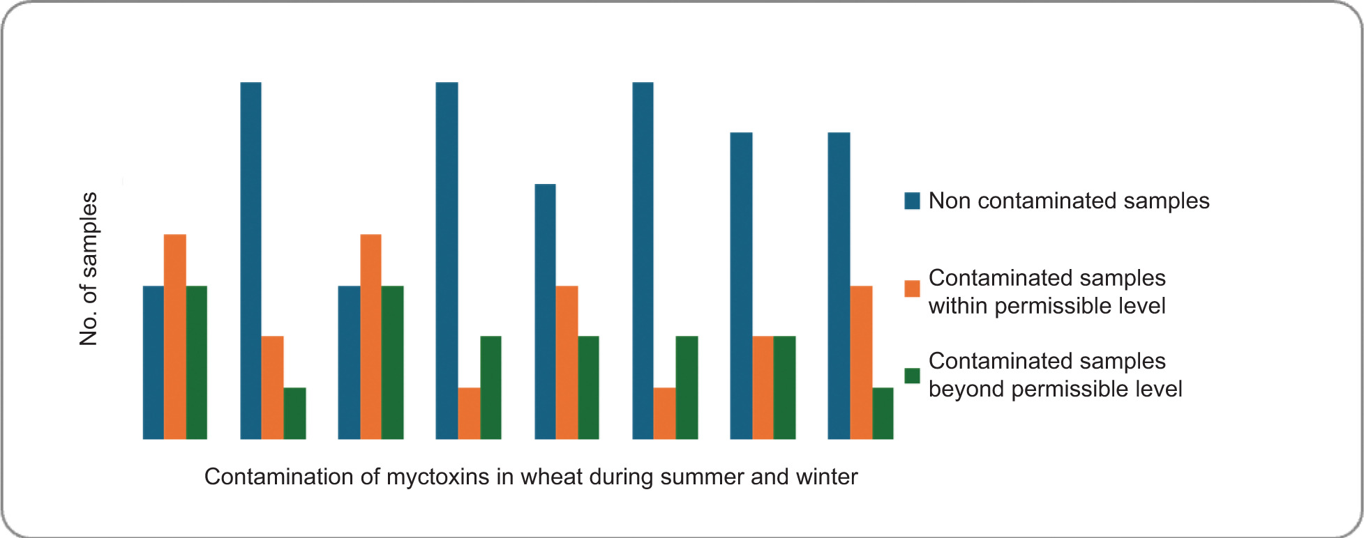 The season may greatly affect fungal growth as it is clear from the study that wheat samples collected in summer are more contaminated with mycotoxins than the wheat samples collected in winter (Figure 7). In a study, it was found that higher temperatures from 20 to 40ºC are favorable for toxin production (Sousa et al., 2019) while toxin production was minimum at 5ºC. The present study is in accordance with the reported work as contagion of mycotoxins was more in summer than in winter. In another study on feed, the effect of temperature on Aspergillus flavus production was studied, and it was found that in high temperature months, the incidence ranged between 66 and 93% while in cold temperature months, it reduced to 40%. High temperature and moisture may increase fungal contamination (Asif M, 2024; Iram et al., 2019; Tittlemier, et al., 2025).