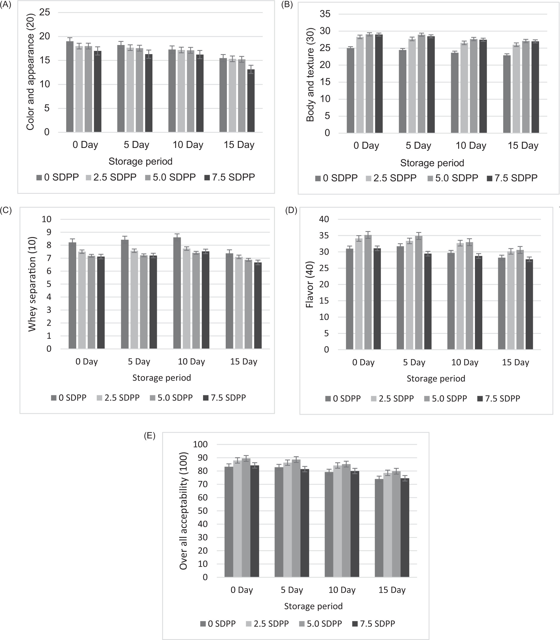 SDPP, yogurts fortified with Sidr dried pulp powder concentrate (0, 2.5s, 5.0, and 7.5%); TS, total solids.