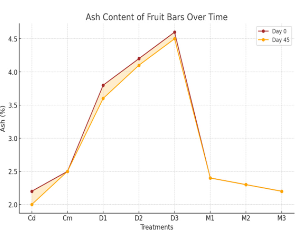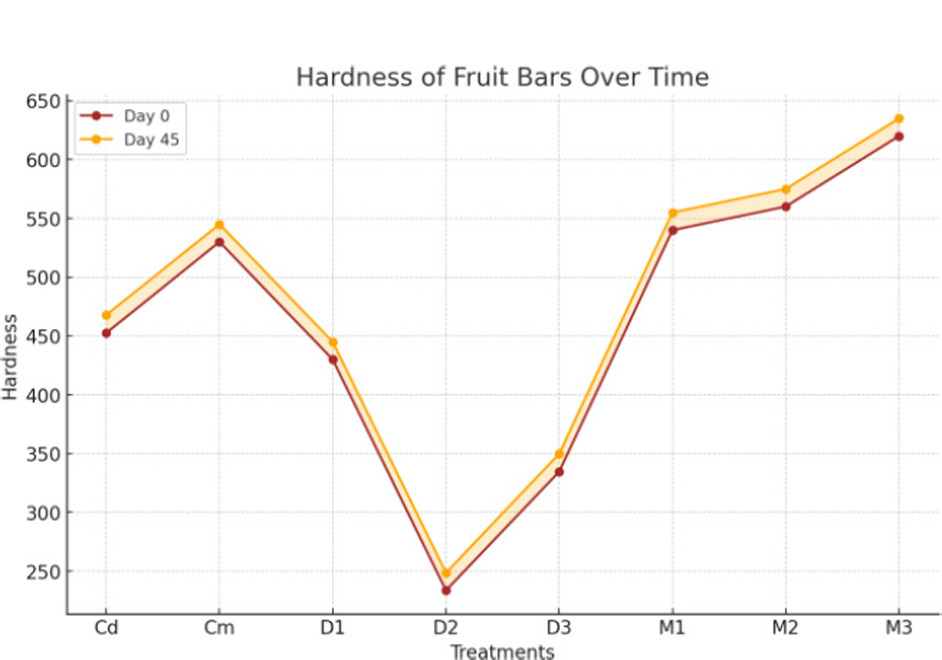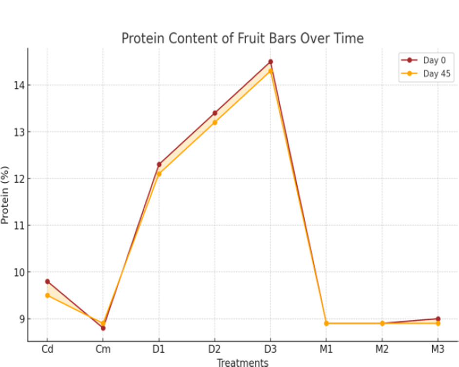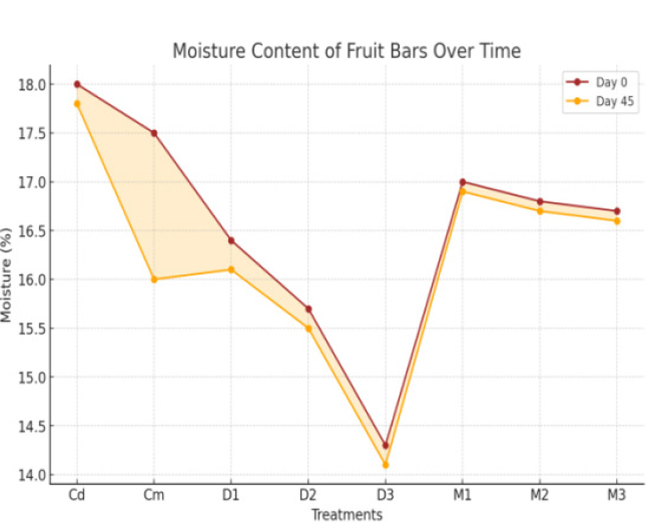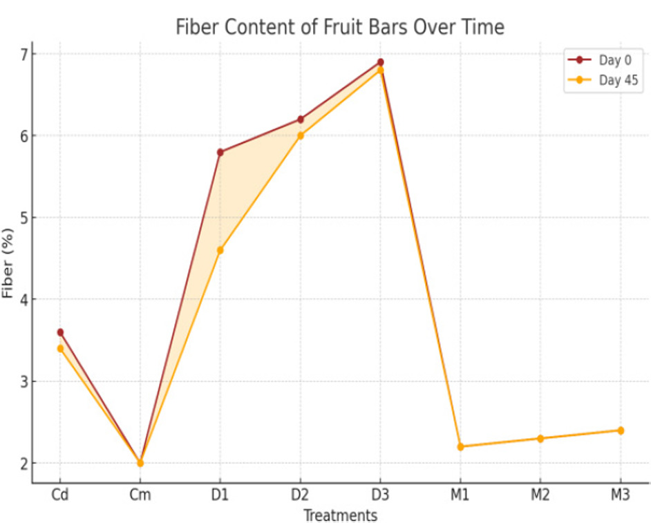 For proximate analysis of fruit bars, the results presented in Figures 1–5 show that moisture content had non-significant (p < 0.01) interactions during days but showed a significant (p < 0.01) effect for treatments. Moisture content ranged from 17.988% (Cd) to 14.258% (D3), with a maximum of 18.253% (Cd, day 15) and a minimum of 14.130% (D3, day 45). The data presented in Figure 2 reveal that ash content showed no significant (p < 0.01) interactions during days but showed significant (p < 0.01) effects for treatments. Ash content ranged from 4.6258% (D3) to 2.1650% (Cd), with a maximum of 4.6867% (D3, day 0) and a minimum of 2.0767% (Cd, day 45). The data given in Figure 3 show that crude fat content had significant (p < 0.01) interactions and treatment effects. Fat content ranged from 7.0883% (D3) to 0.9550% (M2), with a maximum of 7.1333% (D3, day 0) and a minimum of 0.9400% (M2, day 45). Similarly, Figure 4 presents results showing that crude protein content exhibited no significant (p < 0.01) interactions but demonstrated significant treatment effects on fruit bars. Protein content ranged from 14.437% (D3) to 8.893% (Cm), with a maximum of 14.514% (D3, day 0) and a minimum of 8.880% (Cm, day 15). The data presented in Figure 5 show that crude fiber content had significant (p < 0.01) interactions and treatment effects. Fiber content ranged from 6.8883% (D3) to 3.5500% (Cd), with a maximum of 6.9533% (D3, day 0) and a minimum of 2.0000% (Cm, day 45). The results presented in Figure 6 indicate that NFE content had significant (p < 0.01) interactions and treatment effects. The NFE content decreased for most treatments from day 0 to day 45, with a sharp increase observed in M1, M2, and M3 by day 45. Our findings on the proximate analysis of fruit bars revealed significant effects of treatments on moisture, protein, fat, fiber, ash, and NFE content, while interactions over days were generally non-significant. A similar chemical composition of energy bars developed from quinoa and other ingredients has also been reported by Kaur et al. (2018). These results align with findings demonstrating that the nutritional composition of fruit- and vegetable-based products varies significantly depending on the treatment methods and composition of raw materials (Kamau et al., 2020). The crude protein and ash content variations observed in our study are comparable to reports highlighting the impact of processing on protein and mineral retention in fruit-based products (Umar et al., 2021). Furthermore, the variations in fiber and carbohydrate levels are consistent with findings showing that blending ratios and processing techniques significantly influence these parameters in fruit-based products (Arinzechukwu & Nkama, 2019). The use of pseudocereals in the fruit bars has been found increasingly beneficial due to the high amount of ash, fiber, and protein contents in these crops (Sabeel et al., 2024).