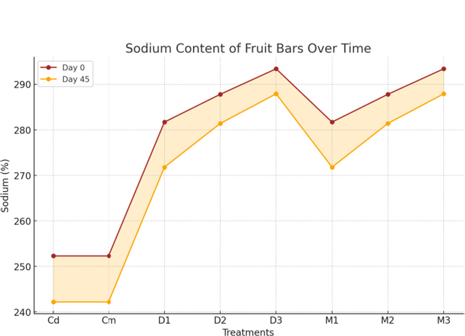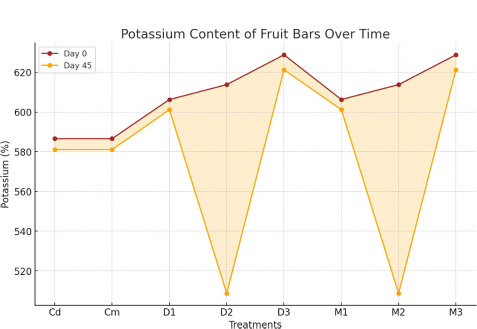 Fruit bars having cereals and pseudocereals could be a good source of macro minerals (Kaur et al., 2018). For mineral analysis, the results presented in Figure 7 show that sodium content in fruit bars had non-significant (p < 0.01) interactions during days and treatments, with values ranging from 422.79 mg/100g (Cd) to 277.14 mg/100g (M1). The maximum value was 293.40 mg/100g (D3, day 0), and the minimum was 242.25 mg/100g (Cm, day 45). Further, the data presented in Figure 8 show that potassium content in fruit bars exhibited significant (p < 0.01) interactions during days and treatments, ranging from 625.90 mg/100g (D3) to 584.12 mg/100g (Cm). The highest value was 628.87 mg/100g (D3, day 0), and the lowest was 508.78 mg/100g (D2, day 45). Moreover, the data given in Figure 9 show that calcium content in fruit bars had non-significant (p < 0.01) interactions during days and treatments, with values ranging from 213.72 mg/100g (Cd) to 144.03 mg/100g (M1). The maximum value was 462.68 mg/100g (Cd, day 30), and the minimum was 127.50 mg/100g (Cm, day 45). Our findings were in accordance with studies showing that sodium levels in fruit-based products are minimally influenced by treatment variations but slightly affected by preparation methods (Pertiwi et al., 2022). Our analysis was very comparable with research demonstrating that potassium plays a crucial role in determining nutrient composition and quality, significantly influenced by treatments (Sahu et al., 2023). Additionally, our results were in line with findings highlighting that calcium content remains stable across treatments and contributes to the structural integrity of fruit-based products (Czech et al., 2020). Because pseudocereals contain a lot of minerals, their usage in fruit bars has been shown to be increasingly advantageous. Pseudocereals are high in vital minerals and have been validated for their ability to promote health, making them appropriate for people with mineral deficiencies (Sabeel et al., 2024).