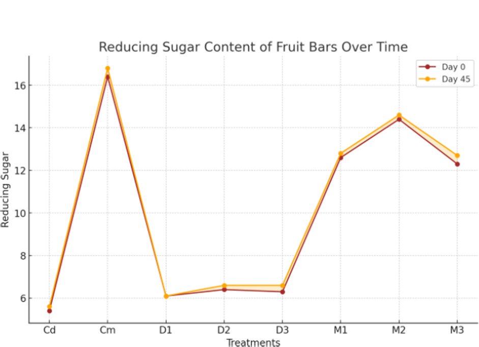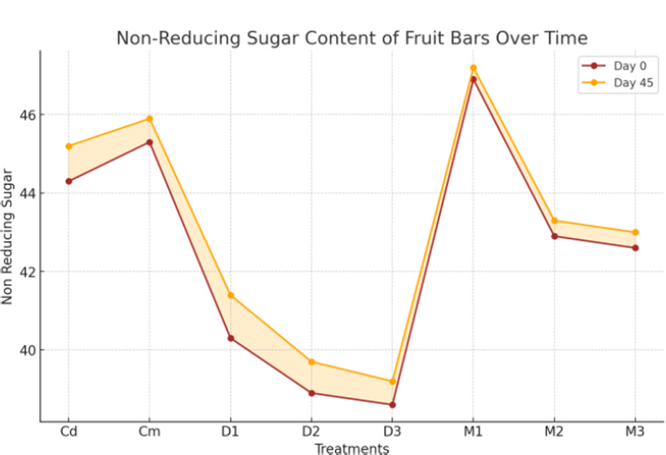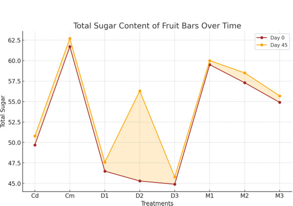 The sugar contents and variations in the total, reducing, and non-reducing sugars depend upon the ingredients and raw materials used in the development of food bars (Kaur et al., 2018). The result presented in Figure 10 shows that total sugars in fruit bars exhibited a highly significant (p < 0.01) interaction during days and treatments. The combined effect of treatment and days was non-significant (p < 0.05). Total sugars ranged from 62.150% (Cm) to 45.300% (D3). The maximum value was 62.700% (Cm, day 45), and the minimum was 44.900% (D3, day 0). These findings highlight significant differences based on treatments and storage duration. Data in Figure 11 depicts that reducing sugar contents ranged from 6.0% (Cd) to 16.0% (Cm) across treatments, with a significant increase noted in M1, M2, and M3 by day 45. Moreover, it can be examined from Figure 12 that non-reducing sugar content ranged from 40.0% (D3) to 46.0% (Cm), with day 45 depicting elevation for most treatments, particularly in M1, M2, and M3. The results of this study align with previous findings that total sugar content in fruit bars significantly varies depending on treatment methods and ingredient composition, with minimal interaction effects over storage time (Munir et al., 2018). These findings also correspond with evidence that sugar levels in fruit-based products are influenced by blending ratios and processing techniques, which contribute to the stability and nutritional value of the bars (Eyiz et al., 2020). Furthermore, the impact of sugar content on sensory properties and consumer acceptability reinforces the importance of optimizing sugar levels for producing high-quality fruit bars (Srivastava et al., 2019).