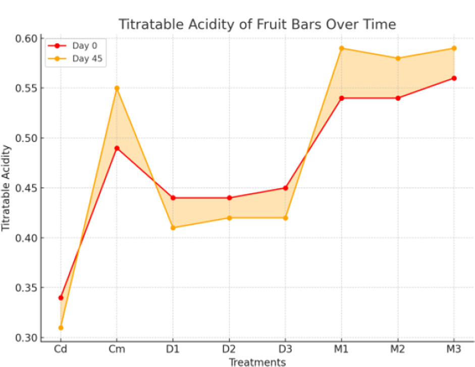 The data given in Figure 13 show that titratable acidity in fruit bars had a non-significant (p < 0.01) interaction during days but exhibited a highly significant (p < 0.01) impact during treatments. The data given in Figure 13 indicate that titratable acidity ranged from 0.5750% (M3) to 0.3283% (Cd). The maximum value recorded was 0.5900% (M1, day 45), while the minimum was 0.3167% (Cd, day 45). These results highlight the significant effect of treatments on acidity levels in fruit bars. Our findings were in line with studies that reported the significant impact of treatments on titratable acidity in fruit-based products, demonstrating that treatments influence acidity levels while storage duration has a lesser effect (Yulistiani et al., 2022). The results were also comparable with research showing that the use of specific acidulants and processing methods significantly affect acidity and other chemical properties of fruit products (Tsegay, 2020). Additionally, our findings were consistent with studies emphasizing that variations in acidity contribute to the sensory attributes and overall quality of fruit-based bars (Gahane et al., 2024). This variation in the titratable acidity of the bar treatments could be attributed towards high acidity of mango pulp as compared to the date fruit, which might have contributed towards the rise in the acidity (Siddique et al., 2024).
