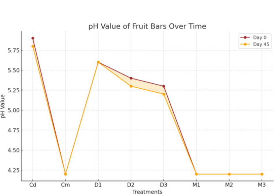The result explained in Figure 14 shows that the pH of fruit bars had a non-significant (p < 0.01) interaction during days but exhibited a highly significant (p < 0.01) impact during treatments. The data given in Figure 14 depict that pH values ranged from 5.9050 (Cd) to 4.2150 (M3). The maximum pH noted was 5.9200 (Cd, day 0), while the minimum was 4.2000 (M3, day 45). These findings suggest that treatments significantly affected the pH levels in fruit bars. Our results were in accordance with findings that treatments significantly influence pH levels in fruit-based products, while the impact of storage time remains minimal (Eyiz et al., 2020). Our analysis was very much comparable with studies highlighting that pH adjustments during processing can enhance the sensory and shelf-stability characteristics of fruit bars (Hanum et al., 2022). Additionally, our results were in line with research showing that pH stability is a crucial factor for maintaining the chemical integrity of fruit-based products during storage and handling (Gireesh et al., 2022). As mango and date have different pH values, which are also different from quinoa, the different variations of these ingredients are responsible for the variations in the pH of the bars.