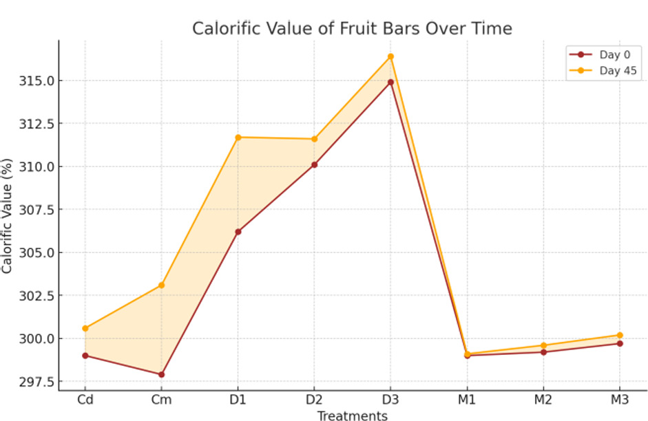 The result presented in Figure 15 demonstrates that the calorific value of fruit bars showed a significant (p < 0.01) interaction across days and a highly significant (p < 0.01) effect across treatments. The data given in Figure 15 indicate that calorific values ranged between 316.41 kcal (D3) and 297.90 kcal (Cm). The mean values for treatments were between 315.57 kcal (D3) and 299.10 kcal (M1), while the mean values for days ranged from 303.29 kcal (day 0) to 305.34 kcal (day 45). The highest calorific value was 316.41 kcal (D3, day 45), and the lowest was 297.90 kcal (Cm, day 0). The bars having date as their ingredient have shown high calorific values, which are found to further increase as a result of higher levels of quinoa; these are possibly due to the high carbohydrates in these ingredients. Our findings were in accordance with studies showing that the calorific value of fruit bars is significantly influenced by treatments, with changes reflecting variations in the nutritional composition of the ingredients used (Munir et al., 2018). The results are comparable with research highlighting the importance of processing methods and ingredient composition in determining the calorific value of snack bars, which can significantly vary based on treatment combinations (Saletnik et al., 2021). Additionally, the data align with studies emphasizing that the calorific content of fruit bars is a critical factor for energy-dense snacks, ensuring product acceptance and consumer satisfaction (Eyiz et al., 2020).