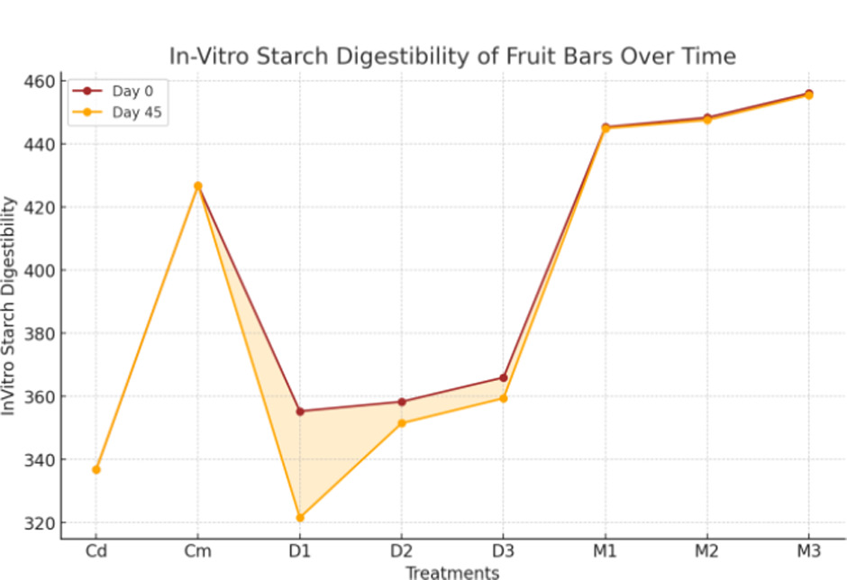 Figure 16 depicts that in-vitro starch digestibility of fruit bars had a non-significant (p < 0.01) interaction over the days but displayed a highly significant (p < 0.01) effect for treatments. The data presented in Figure 16 reveal that digestibility values varied between 455.76% (M3) and 336.86% (Cd). The mean values for days ranged from 399.14% (day 0) to 393.04% (day 45). The highest digestibility observed was 456.00% (M3, day 0), and the lowest was 321.64% (D1, day 45). The results were consistent with studies showing that treatment variations significantly influence in-vitro starch digestibility in fruit-based products due to structural modifications in the starch matrix (Zhang et al., 2019). These findings support evidence that heat and moisture-based processing techniques enhance enzymatic digestibility by altering starch crystallinity and molecular arrangement (Yan et al., 2020). Furthermore, the relationship between processing-induced changes in starch structure and improved digestibility aligns with prior research emphasizing the importance of functional modifications in optimizing the nutritional quality of fruit-based products (Zhou et al., 2020).