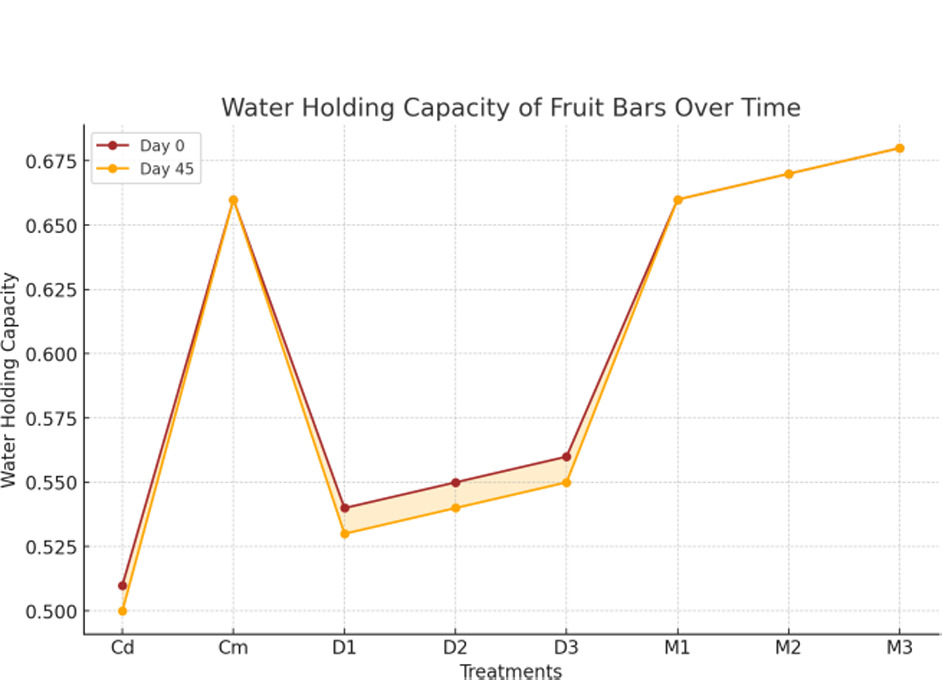 Figure 17 reveals that the water holding capacity of fruit bars was significantly (p < 0.01) influenced by treatments, while interactions across days remained non-significant (p < 0.01). Notably, the water holding capacity varied across treatments, with values ranging from 0.6873% for M3 to 0.5077% for Cd. Across days, the mean values slightly fluctuated between 0.6085% (day 0) and 0.6043% (day 45). The highest water holding capacity, 0.6890%, was observed in M3 on day 45, while the lowest, 0.5080%, occurred in Cd on day 15. Our findings were in line with research emphasizing that water holding capacity in fruit-based products is significantly influenced by treatments due to modifications in structural composition, while storage duration has minimal impact (Ozilgen, 2011). The results were comparable with studies that demonstrated the role of enzymatic and compositional changes in enhancing water retention properties, crucial for the textural and sensory quality of fruit bars (Canela-Xandri et al., 2018). Additionally, our analysis aligned with findings highlighting that coating and processing methods can optimize water activity and moisture retention in fruit-based snacks, contributing to prolonged shelf life and consumer acceptance (Eyiz et al., 2020). These higher water holding capacities of mango and quinoa-based bars could be attributed towards the high fiber contents in the mango and quinoa (Sabeel et al., 2024; Kaur et al., 2018).