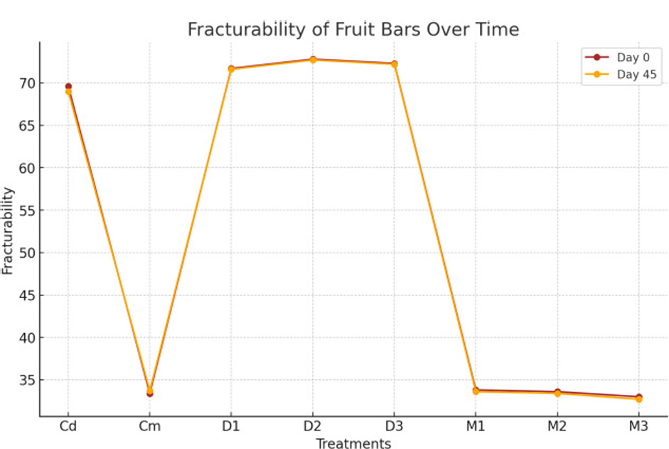 The data in Figure 18 illustrates a highly significant (p < 0.01) effect of treatments and days on the hardness of fruit bars, while the combined effect of treatment and days was non-significant (p < 0.05). Treatment values ranged from 627.50 (M3) to 241.30 (D2), showing considerable variation. Day-based means were 462.64 (day 0) and 477.68 (day 45), indicating a slight increase over time. The maximum recorded hardness was 635.00 (M3, day 45), while the minimum was 233.77 (D2, day 0). As presented in Figure 19, treatments had a highly significant (p < 0.01) effect on the fracturability of fruit bars, while interactions over days and the combined influence of treatments and days were non-significant (p < 0.05). Fracturability values varied from 72.790 (D2) to 32.871 (M3) across treatments. The day-based means were nearly stable, with 52.542 recorded at day 0 and 52.419 at day 45. The highest value, 72.820, was observed in D2 on day 0, while the lowest, 32.740, was recorded in M3 on day 45. The high hardness of mango bars having higher levels of quinoa might be due to the hard texture of these bars resulting from the high quinoa starch presence, while date bars, due to more water absorption, have shown low hardness values. The results confirm that treatments play a crucial role in determining the hardness and fracturability of fruit bars, as significant changes were observed across treatment variations (Eyiz et al., 2020). This study further supports findings that structural integrity, particularly hardness, can be improved through optimized processing techniques and ingredient modifications (Munir et al., 2018). Moreover, the observed variations in fracturability align with research showing that moisture content and protein interactions greatly influence textural stability and consumer acceptability (Ud Din et al., 2025; Kigozi et al., 2024). The variations of other ingredients like fat, fiber, and carbohydrates might also have contributed to the differences in hardness and fracturability of these bar treatments.