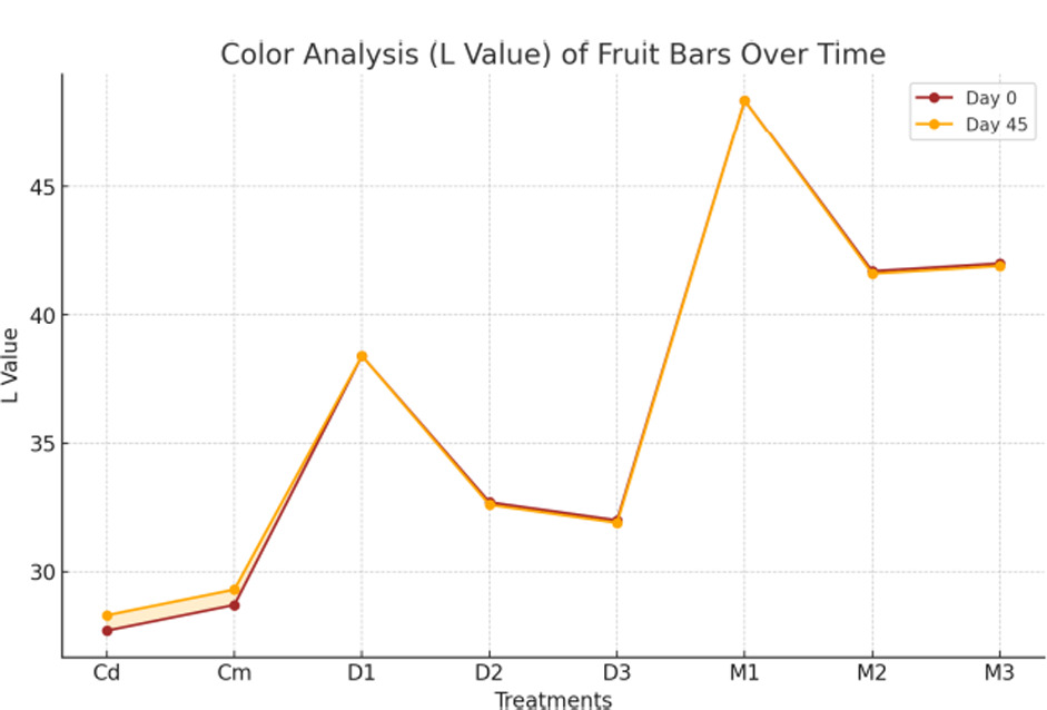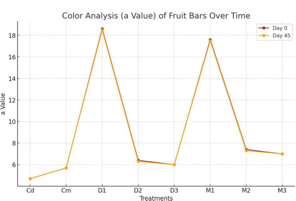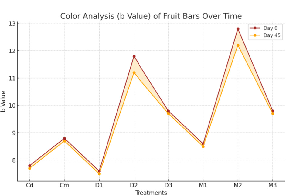 Figures 20, 21, and 22 respectively reveal that the treatments significantly (p < 0.01) influenced the ‘L’, ‘a’, and ‘b’ color values of fruit bars, while interactions across days were non-significant (p < 0.01). However, the combined effect of treatments and days was highly significant (p < 0.05). The ‘L’ value ranged from 48.450 (M1) to 28.000 (Cd), the ‘a’ value from 18.605 (D1) to 4.732 (Cd), and the ‘b’ value from 12.500 (M2) to 7.570 (D1). Across days, mean values for ‘L’, ‘a’, and ‘b’ decreased slightly, with ‘L’ reducing from 36.485 (day 0) to 16.246 (day 45), ‘a’ from 9.2100 (day 0) to 9.1575 (day 45), and ‘b’ from 9.6450 (day 0) to 9.4375 (day 45). The maximum values recorded were 48.480 (‘L’, M1, day 0), 18.630 (‘a’, D1, day 0), and 12.800 (‘b’, M2, day 0), while the minimum values were 27.700 (‘L’, Cd, day 45), 4.710 (‘a’, Cd, day 45), and 7.520 (‘b’, D1, day 45). The results are consistent with research showing that treatments significantly influence the L*, a*, and b* color values of fruit-based products, highlighting the importance of ingredient composition and processing techniques in enhancing visual appeal (Eyiz et al., 2020). These findings align with studies that demonstrate how color parameters are crucial for consumer acceptance, as they are directly linked to perceived quality and freshness (Manasa et al., 2020). Moreover, our results complement evidence suggesting that controlled treatments can stabilize color properties over time, ensuring consistency and prolonged shelf life in fruit products (Aghajanzadeh et al., 2023). The bars having low levels of quinoa and high levels of date and mango showed higher a* and b* values, while lower L* values, possibly due to the high pigments in mango and date compared to quinoa (Kaur et al., 2018; Hussain et al., 2024b).