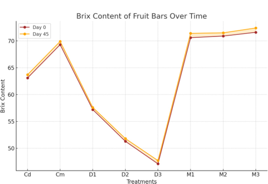 Data in Figure 23 highlights that the Brix content of fruit bars was significantly (p < 0.01) affected by treatments and days, while their combined interaction was not statistically significant (p < 0.05). The Brix content varied across treatments, ranging from 71.975 (M3) to 47.350 (D3). Mean values across days showed minimal differences, with 62.654 on day 0 and 63.250 on day 45. The highest Brix content, 72.400, was observed in M3 on day 45, while the lowest, 47.100, was recorded in D3 on day 0. These results indicate that treatments had a pronounced effect on Brix content, with storage time contributing less variability. The findings are consistent with studies highlighting the significant influence of treatments on Brix content in fruit bars, emphasizing that ingredient composition and processing methods play a pivotal role in regulating sweetness levels (Eyiz et al., 2020). These results also align with research demonstrating that Brix levels are crucial for consumer acceptance, as they determine the perceived quality and flavor of fruit-based products (Aslam et al., 2023). Furthermore, our results support evidence that storage duration has a relatively minor effect on Brix content compared to the significant impact of treatments, which ensure consistency and enhance product stability (Arinzechukwu & Nkama, 2019). The similar sugar contents of quinoa and mango may be responsible for the small variations in the Brix of mango-quinoa bars, whereas the larger differences in sugar content between date and quinoa likely account for the significant variation in the Brix of date bars containing different levels of quinoa.