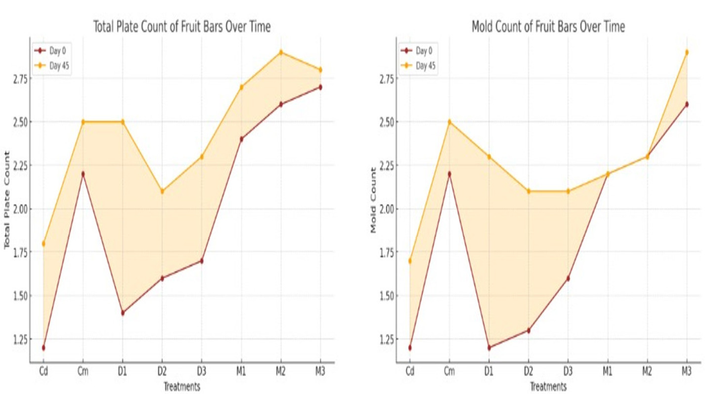 The results presented in Figure 24 show that the total plate count and mold count of fruit bars were significantly (p < 0.01) affected by both treatments and storage days, with a highly significant (p < 0.05) combined effect. The total plate count ranged from 2.7897 CFU/g (M2) to 1.5750 CFU/g (Cd), while mold count ranged from 2.7975 CFU/g (M3) to 1.4975 CFU/g (Cd). The highest values recorded were 2.9600 CFU/g for total plate count (M2, day 45) and 2.0000 CFU/g for mold count (M3, day 45), whereas the lowest counts were 1.2300 CFU/g (Cd, day 0) and 1.2060 CFU/g (D1, day 0), respectively. Our findings are consistent with previous studies indicating that microbial loads, including total plate and mold counts, are significantly influenced by treatments and storage duration in fruit-based products, underscoring the importance of effective processing techniques for ensuring microbial safety (Arinzechukwu & Nkama, 2019). These results align with research demonstrating that appropriate treatments can significantly reduce microbial growth while maintaining sensory quality, thereby extending shelf life (Eyiz et al., 2020). Furthermore, the data highlight that combining suitable ingredient formulations with optimized storage conditions can minimize microbial contamination, enhancing the overall safety and quality of fruit-based snacks (Rasouli et al., 2019). The antimicrobial properties of quinoa may explain the lower total plate and mold counts observed in bars with higher quinoa content (Dev and Gupta, 2024). Additionally, bioactive compounds present in mango pulp likely contributed to the reduced microbial counts in these bars (Hussain et al., 2024a).