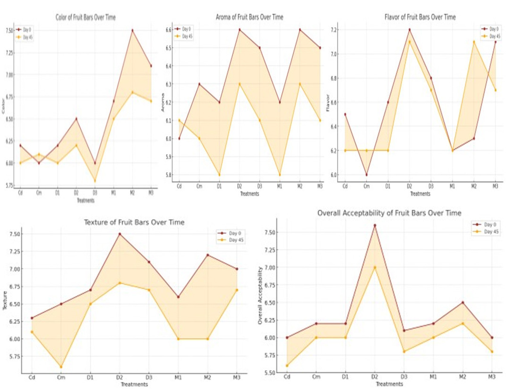 The data presented in Figure 25 show that aroma, color, flavor, texture, and overall acceptability of fruit bars were significantly (p < 0.01) influenced by treatments, while interactions over days and the combined effect of treatments and days were non-significant (p < 0.05). Mean scores across treatments ranged from 6.5938 to 5.9688 for aroma, 7.1875 to 6.0938 for color, 7.1250 to 6.2674 for flavor, 6.9375 to 6.0035 for texture, and 7.1875 to 5.8750 for overall acceptability. The highest values observed on day 0 were 6.6250 (aroma, M2), 7.5000 (color, M2), 7.2500 (flavor, D2), 7.5000 (texture, D2), and 7.6250 (overall acceptability, D2). The lowest values, recorded on day 45, were 5.8750 (aroma, M1), 5.8750 (color, D3), 6.2500 (flavor, Cd), 5.6250 (texture, Cm), and 5.6250 (overall acceptability, Cd). These findings highlight clear variations in sensory attributes based on treatment formulations. Our results align with previous studies emphasizing the significant influence of treatments on sensory qualities such as aroma, color, flavor, texture, and overall acceptability—key factors for consumer satisfaction (Amalia et al., 2022). These observations are consistent with research demonstrating that optimized treatments can enhance sensory characteristics, including texture and flavor, leading to improved consumer acceptability (Tagud et al., 2024). Furthermore, our findings agree with studies showing that sensory stability can be maintained over storage time, ensuring long-term product quality (Verma & Bisen, 2020). The observed improvements in color and flavor support previous research highlighting the role of specific treatments in enhancing the visual appeal and taste of fruit bars (Devi et al., 2018). Lastly, these results corroborate evidence suggesting that consumer preferences for sensory attributes can be optimized through ingredient modifications and controlled processing techniques (Akesowan et al., 2020). Based on the findings, it can be concluded that fruit bars containing date and mango with 20% quinoa exhibited higher consumer acceptability compared to treatments with higher quinoa concentrations.