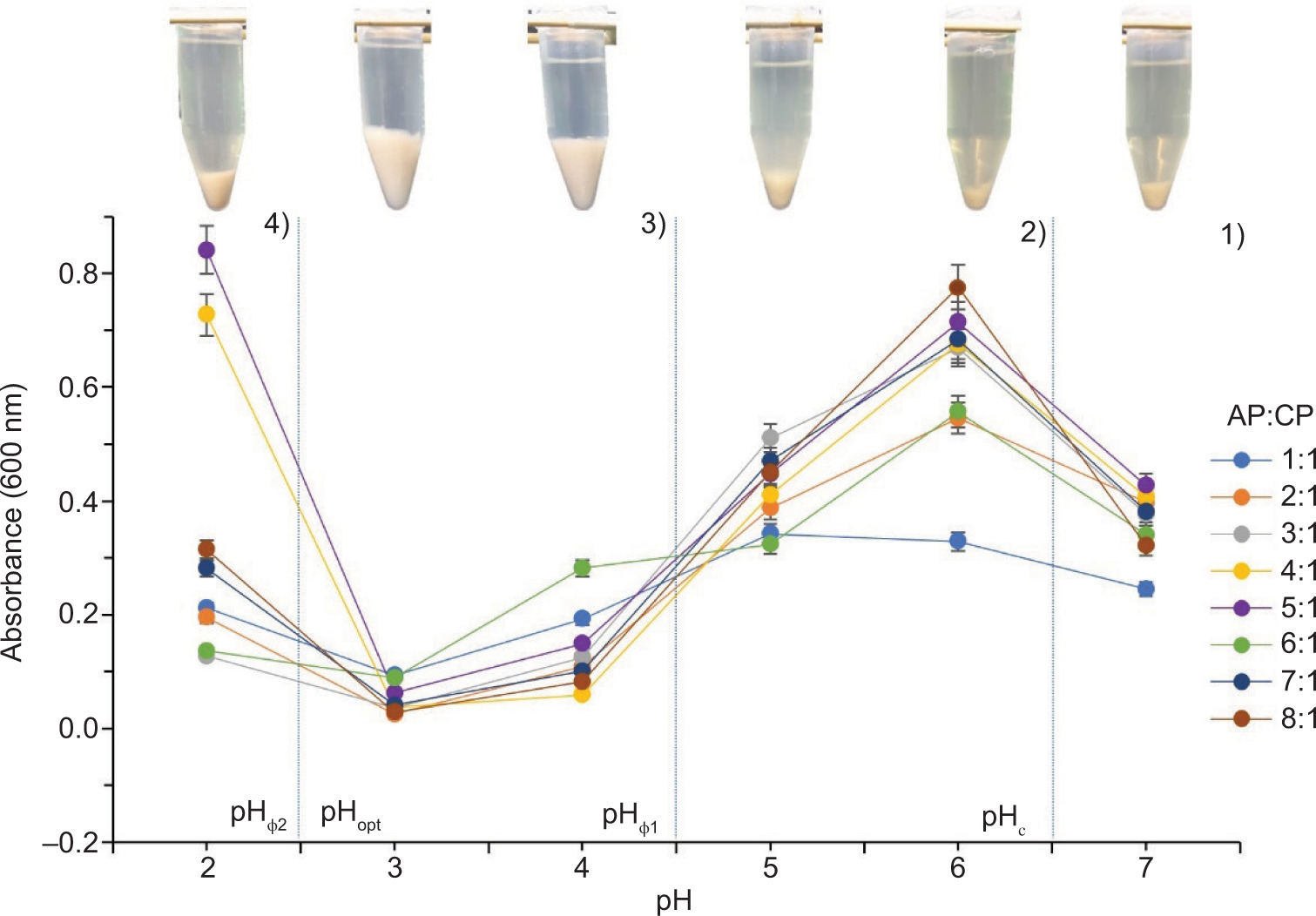 The profiles of the binary coacervates at 2:1 and 5:1 AP:CP weight ratios were similar and characterized by four distinct regions: 1) A region above pH 6.5, where AP and CP coexist without interacting due to strong electrostatic repulsion caused by the negative ζ-potential values of AP (-29.4 ± 0.5 mV) and CP (-48.0 ± 1.3 mV). 2) A region where soluble complexes begin to form at a critical pH of 6.5 (pHc) by binding AP molecules with CP chains, exhibiting a maximum absorbance value at pH 6. Although AP carries an overall negative charge at this pH, certain patches on the molecule contain positive charges due to -NH3+ moieties in the protein backbone that interact with negatively charged CP moieties. This implies that equilibrium phases with higher turbidity contain more macromolecules than translucent solutions (Espinosa-Andrews et al., 2007). 3) A region at pH values below 4.5 (pHɸ1), where greater amounts of AP molecules bind to CP chains as the positive charge density in the protein increases, leading to saturation of functional groups in CP chains and the beginning of aggregation into insoluble complexes. This results in charge neutralization, showing maximum phase separation at pH 3.0 (pHopt) (Ramírez-Santiago et al., 2012). 4) A region where, as the pH decreases further, a second critical pH (pHɸ2) is reached below 3.0; in this zone, insoluble complexes begin to dissociate into soluble complexes or even individual, non-interacting AP and CP molecules (Salminen and Weiss, 2013). This behavior can be attributed to the protonation of AP and CP functional groups, leading to the formation of a system with partially negative charges (Hashemi-Gahruie et al., 2022).