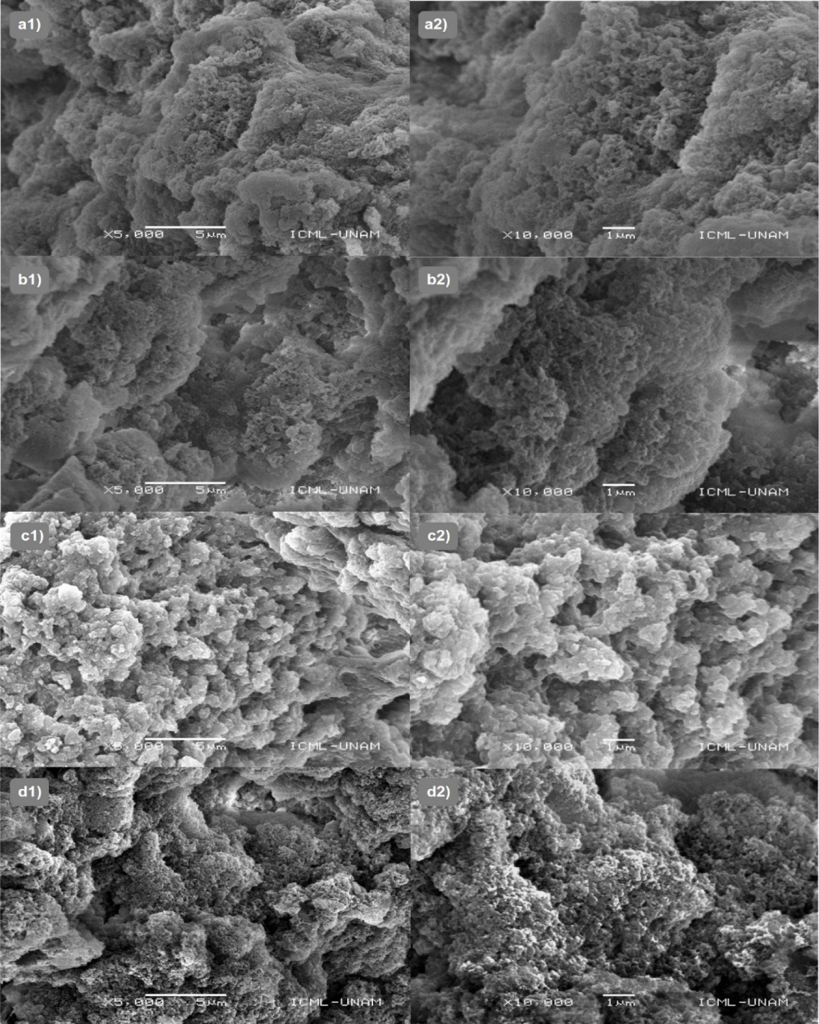 SEM micrographs of the CCa/b variations were obtained with a JSM-6360 Jeol SEM microscope (Tokyo, Japan) at an acceleration voltage of 15 kV. CCa/b were fixed with a solution of 2% (w/v) glutaraldehyde in phosphate buffer (0.1 M, pH 7.2) for 6 h, followed by dehydration in aqueous ethanol solutions with increasing concentrations (20, 30, 50, 60, 70, 80, 90, and 100%, v/v) for 60 min each. Immediately after, CCa/b were critically dried in a CPA II Technics Critical Point Dryer (Tousimis, Rockville, MD, USA). A sample of each CCa/b was placed directly on the surface of an aluminum sample holder with carbon tape and coated with gold at 1.5 kV, 5–6 mA, in a JFC 1100 vacuum sputter coater (JEOL, Tokyo, Japan) (Hernández-Rodríguez et al., 2014). Micrographs are presented at magnifications of 5000× and 10000×.