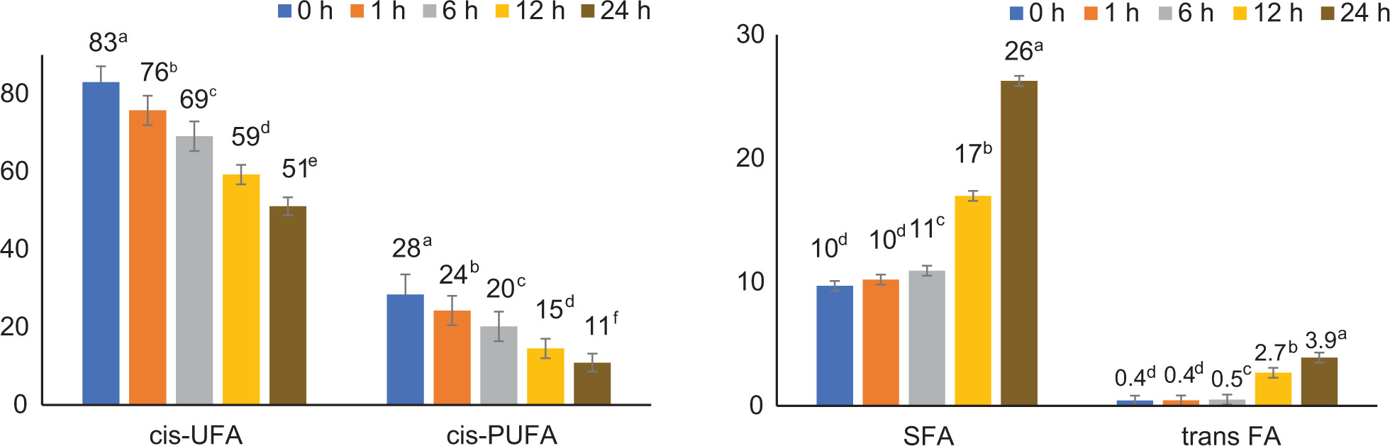 Figure 2. (Panel A) The overall decrease in the contents of total cis-unsaturated fatty acids (cis-UFA) and cis-polyunsaturated fatty acids (cis-PUFA), and (Panel B) increase in the contents of saturated fatty acids (SFA) and trans fatty acids (tFA) during 0-, 1-, 6-, 12- and 24-h heating of four types of hydrogenated fats/ghee. Mean values with different letters differ at p < 0.05.