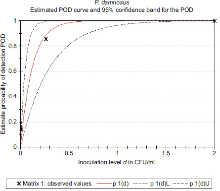 Figure 3 The probability of detection (POD) curve and 95% variation of P. damnosus.