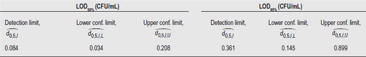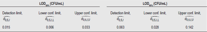 The POD function and LOD were calculated according to the model presented by Wilrich and Wilrich (2009). POD function p(d) is the functional relationship between the probability p of obtaining a measurement result = 1 and the contamination of the test material, quantitatively expressed as the CFU of the microorganism of the defined type per unit of weight or volume, d (CFU/g or CFU/mL).