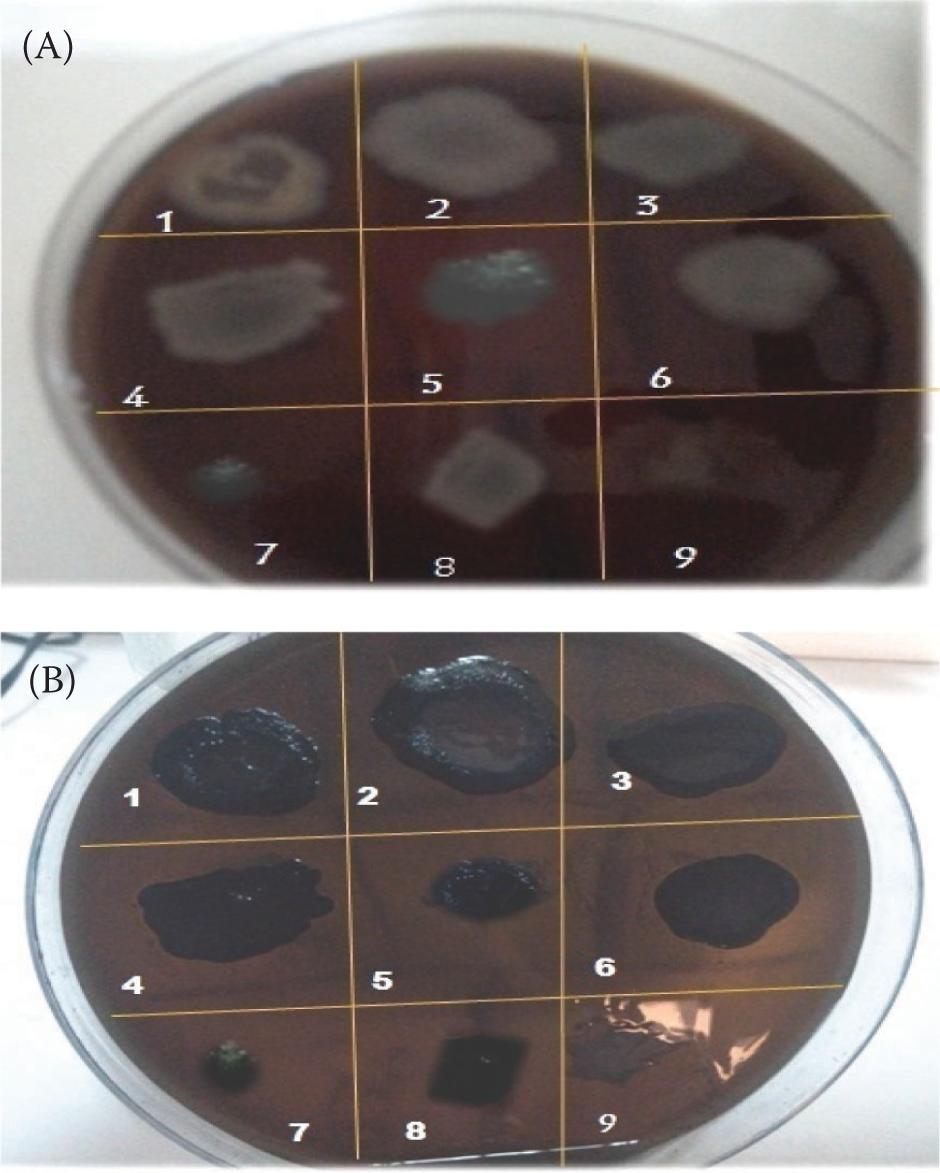 Figure 1. Screening of some bacterial isolates on MSM solid medium with date syrup as carbon source using Sudan Black staining. (A) Before staining, (B) After staining (green-blue colonies). 1:BG1; 2:BG2; 3:BG3; 4:BG4; 5:BG5; 6:BG6; 7:BG7;8:BG8; 9:BG9; BG1-BG9: the nine isolated bacterial strains showing positive PHB production using glucose as carbon source.
