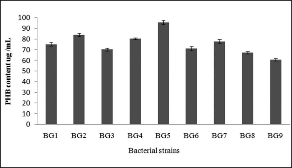 Figure 2. PHB content in the nine isolated bacterial strains. Results are expressed as mean of tri-replicates±standard error. BG1, BG2, BG3, BG4, BG5, BG6, BG7, BG8, and BG9: the nine isolated bacterial strains showing positive PHB productionusing glucose as carbon source.