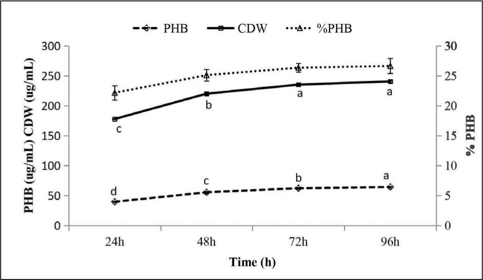 Figure 3. The effect of the incubation period on PHB accumulation. Results are calculated as mean of tri-triplicates ± standard error; different letters indicate significant differences using ANOVA test followed by the post-hoc Fisher test (LSD) at P < 0.05. P = 0.000 for both PHB and CDW.