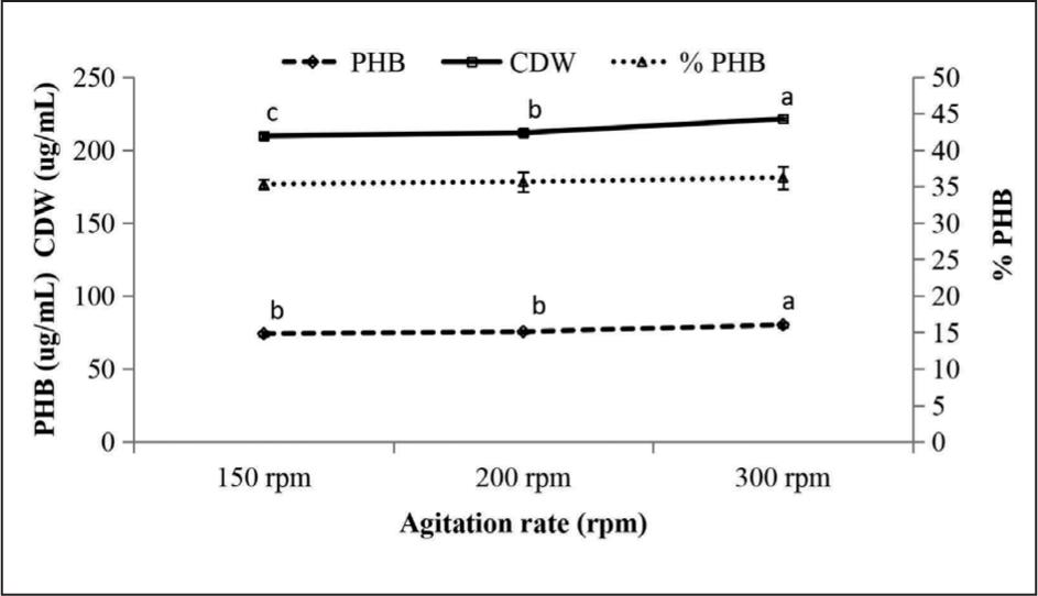 Agitation is an important factor for PHB production. It helps in mixing the oxygen, the heat and the nutrients and facilitates the distribution of air in the nutrient broth so that it increases the liquid-gaz contact area (Mantzouridou et al., 2002). This research revealed that increasing the agitation rate to 300 rpm increased the cells growth (221.35 ug/mL) and the PHB content (80.17 ug/mL) (Figure 4). Slow agitation rate leads to an increase in the viscosity of the culture medium and a reduction of the mass transfer (Bandaiphet and Prasertsan, 2006).
