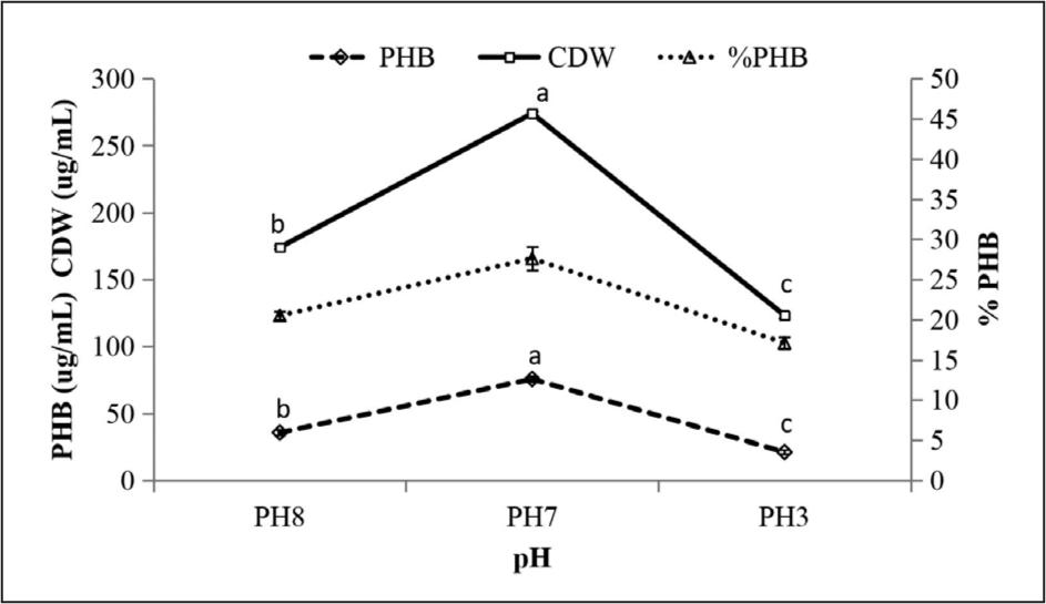 Figure 5. Effect of pH on PHB accumulation. Results are calculated as mean of tri-triplicates ± standard error; different letters indicate significant differences using ANOVA test followed by the post-hoc Fisher test (LSD) at P < 0.05. P = 0.0001 for both PHB content and CDW.