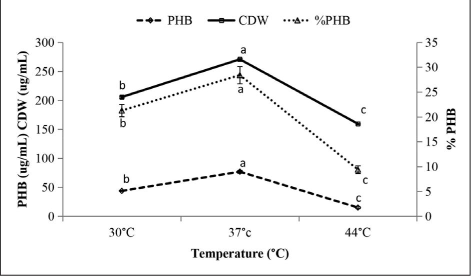 Figure 6. Effect of temperature on PHB accumulation. Results are calculated as mean of tri-triplicates ± standard error; different letters indicate significant differences using ANOVA test followed by the post-hoc Fisher test (LSD) at P < 0.05. P = 0.0001 for both PHB content and CDW.
