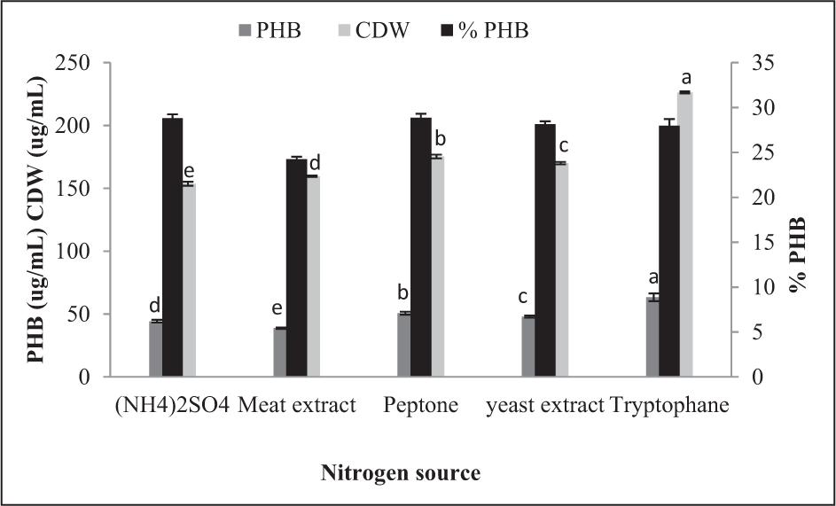 Figure 7. Effect of nitrogen sources on PHB accumulation. Results are calculated as mean of tri-triplicates ± standard error; different letters indicate significant differences using ANOVA test followed by the post-hoc Fisher test (LSD) at P < 0.05. P = 0.000 for both PHB content and CDW.