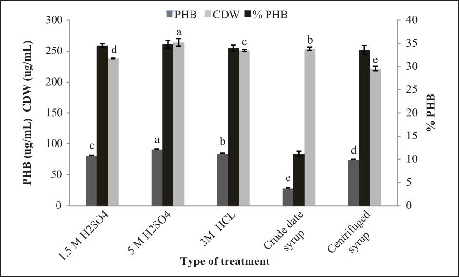 High contents of PHB (89.35 ug/mL) and cells biomass (260.33 ug/mL) were achieved using acid hydrolyzed date syrup in comparison with centrifuged and crude syrup (Figure 8). This is due to the low levels of simple sugars in non treated syrup in comparison with acid-treated syrup (McAdam et al., 2020). Sucrose hydrolysis increased with the increase in sulfuric acid concentration (Sen et al., 2019). The total rate of reducing sugars increased from 31.86 g/L to 78.86 g/L, 72.96 g/L, and 72.2 g/L after treatment of date syrup with 5MH2SO4, 3MHCL, and 1.5 M H2SO4, respectively (Table 1). The same results were reported by Gomaa (2014) where acid preatreated molasses enhanced PHB accumulation in comparison with untreated molasses.