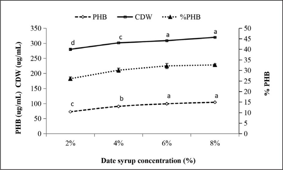 Figure 9. Effect of date syrup concentration on PHB accumulation. Results are calculated as mean of tri-triplicates ± standard error; different letters indicate significant differences using ANOVA test followed by the post-hoc Fisher test (LSD) at P < 0.05. P = 0.000 for both PHB content and CDW.