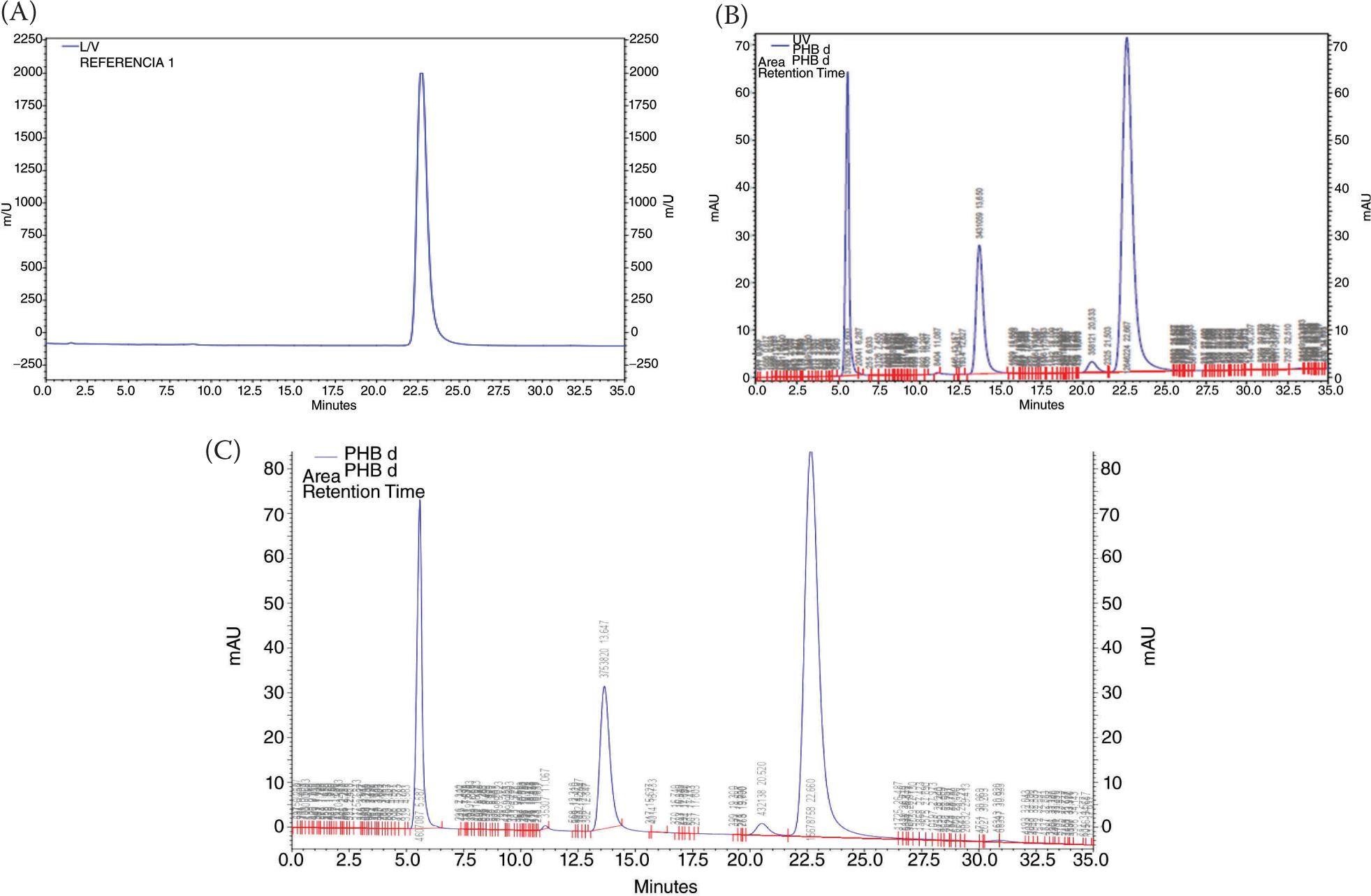 Figure 10. Aminex-HPLC analysis of PHB. (A) Standard crotonic acid (with retention time of 22.5min), (B) Standard pure PHB (with retention time of 22.5 min), (C) produced PHB from date syrup (with retention time of 22.5min).