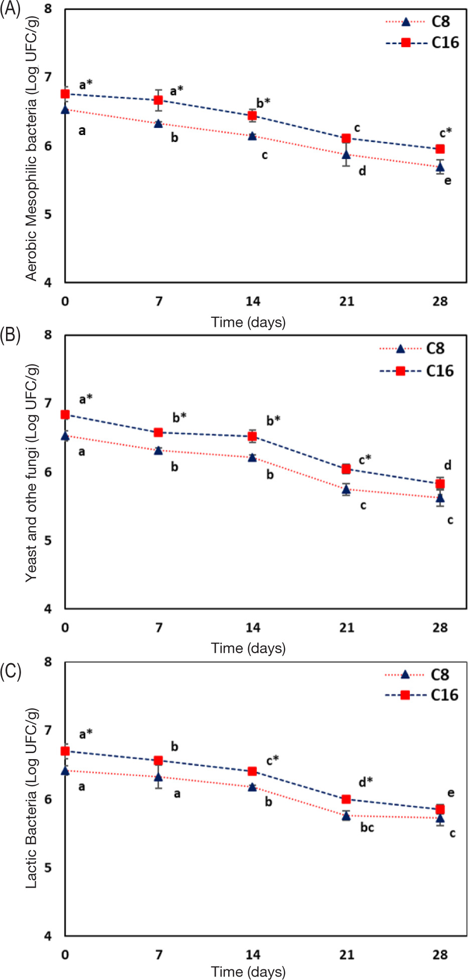 Figure 1. Evolution of total aerobic mesophilic bacteria (A), yeast and other fungi (B), and lactic bacteria (C) expressed as Log UFC/g of the dough rolls samples leavened for 8 (C8; ▲) and 16 h (C16; ■) during 28 days of storage at 2 ± 0.5°C. Each value is represented as mean ± SD (n = 3). a–e For each sample (C8 and C16), different letters indicate statistically significant differences between values during the storage time (Duncan’s test, P < 0.05). “*” indicates statistically significant differences between samples at each storage time (P < 0.05: Student’s t-test).