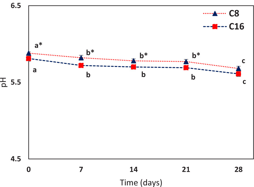 Figure 2. Evolution of pH of the dough rolls samples leavened for 8 (C8; ▲) and 16 h (C16; ■) during 28 days of storage at 2 ± 0.5°C. Each value is represented as mean ± SD (n = 3). a–c For each sample (C8 and C16), different letters indicate statistically significant differences between values during the storage time (Duncan’s test, P < 0.05). “*” indicates statistically significant differences between samples at each storage time (P < 0.05: Student’s t-test).