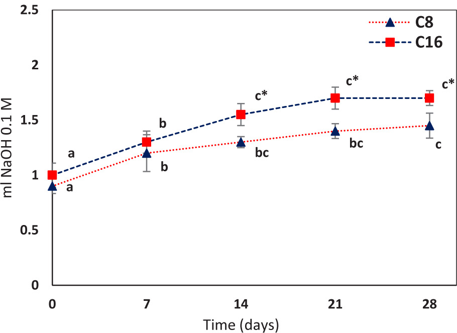 Figure 3. Evolution of TTA of the dough rolls samples leavened for 8 (C8; ▲) and 16 h (C16; ■) during 28 days of storage at 2 ± 0.5°C. Each value is represented as mean ± SD (n = 3). a–c For each sample (C8 and C16), different letters indicate statistically significant differences between values during the storage time (Duncan’s test, P < 0.05). “*” indicates statistically significant differences between samples at each storage time (P < 0.05: Student’s t-test).