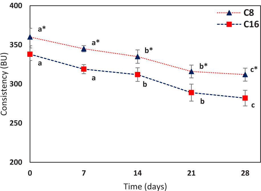 Figure 5. Evolution of consistency (BU) of the dough rolls samples leavened for 8 (C8; ▲) and 16 h (C16; ■) during 28 days of storage at 2 ± 0.5°C . Each value is represented as mean ± SD (n = 3). a–c For each sample (C8 and C16), different letters indicate statistically significant differences between values during the storage time (Duncan’s test, P < 0.05). “*” indicates statistically significant differences between samples at each storage time (P < 0.05: Student’s t-test).