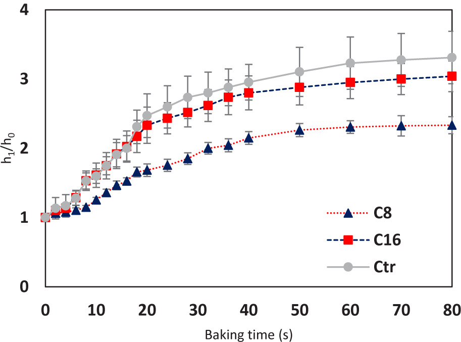 Figure 6. Average value and standard deviation (n = 24) of the ratio between the instantaneous (h1) and initial (h0) heights of the raised rim of pizza samples (▲: C8; ■: C16; •: Ctr) during their baking in a pilot-scale wood-fired oven.